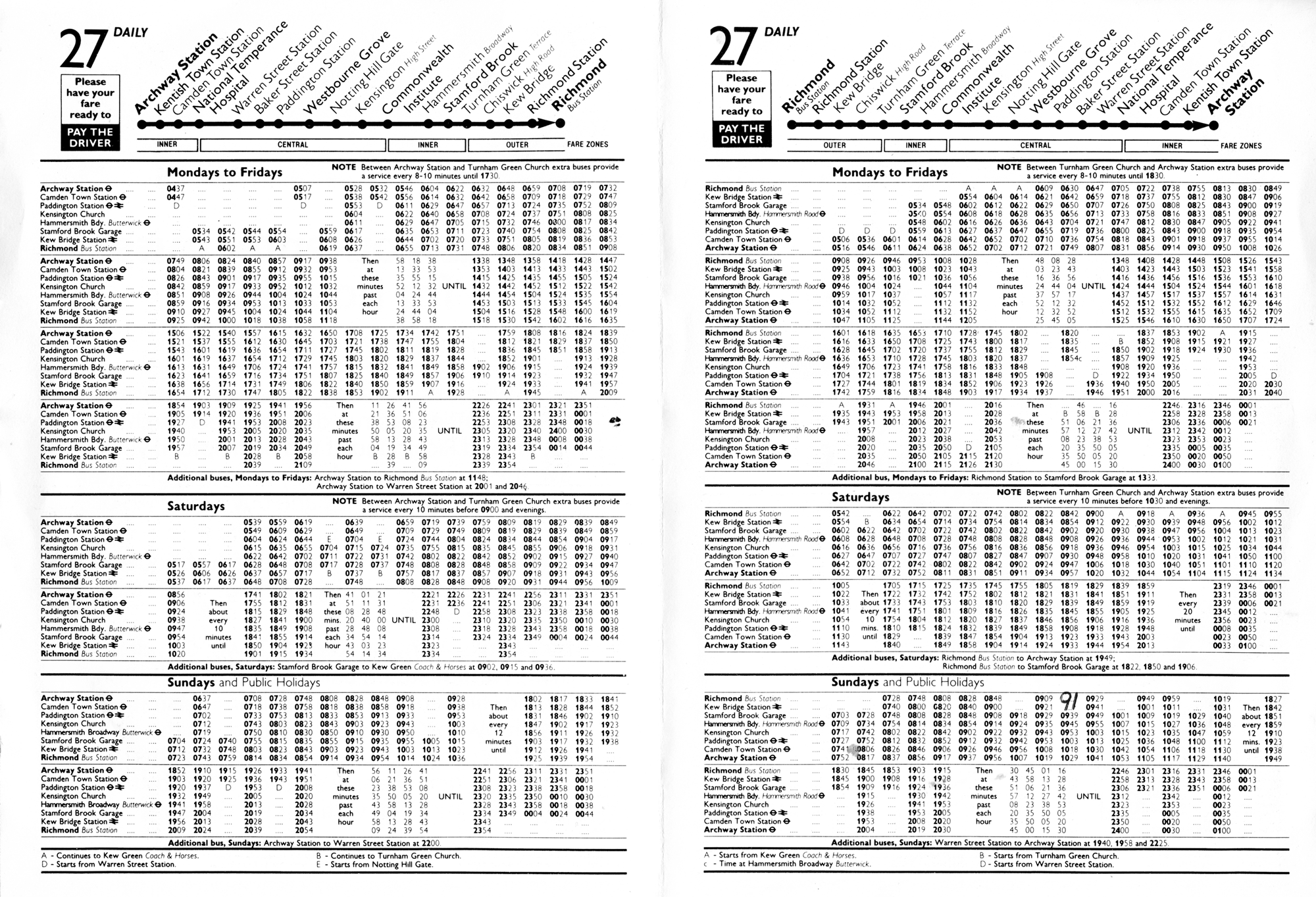 The first change over point was at Kew Bridge - the second was outside Stamford Brook Garage both for meal breaks at Stamford Brook. If you came off at Kew Bridge for your meal break towards Richmond you had to travel back to Stamford Brook - when starting a duty you had check your duty card before getting on the 237 for your change over point - there was one change over done in the evening peak at Hammersmith when finishing and travel back on the tube.