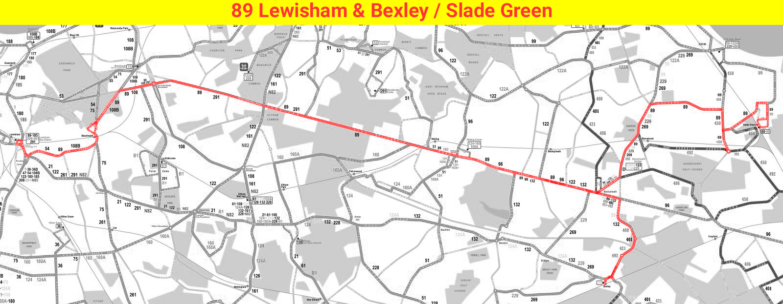 PLUMSTEAD COMMON (Woodman), - Woolwich, Charlton Village - Blackheath -Lewisham, - Catford -Downham - Bromley - BROMLEY COMMON(Chatterton Arms) (Mon-Sat).