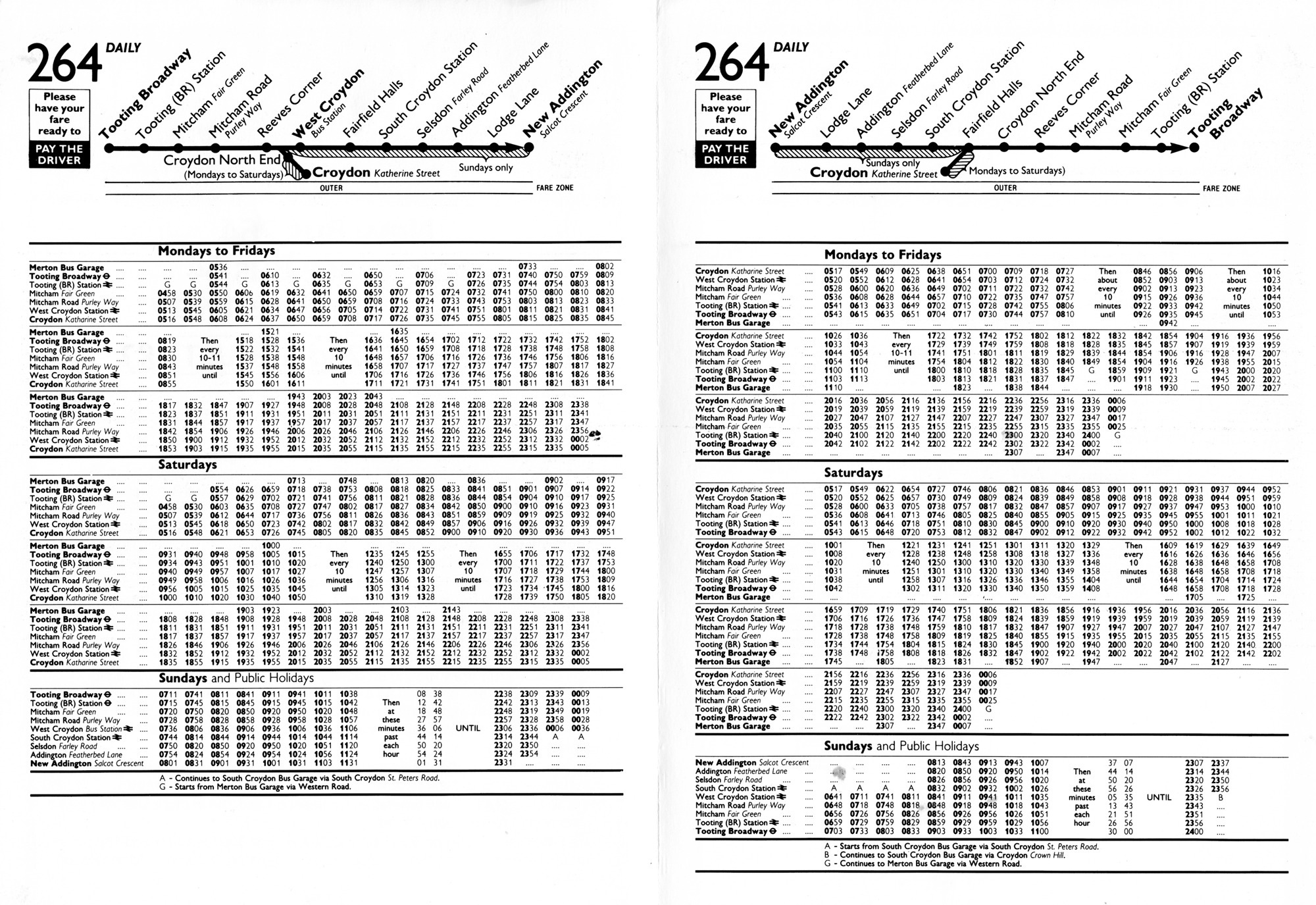 TOOTING BROADWAY - CROYDON ( Mon-Fri evgs / Sat ) - SOUTH CROYDON ( Mon-Fri ) - SOUTH CROYDON GARAGE ( Mon-Fri between peaks / Sat sh ) - NEW ADDINGTON ( Suns ) Croydon (TC) and Merton (AL) allocations withdrawn - and replaced by daily Thornton Heath (TH