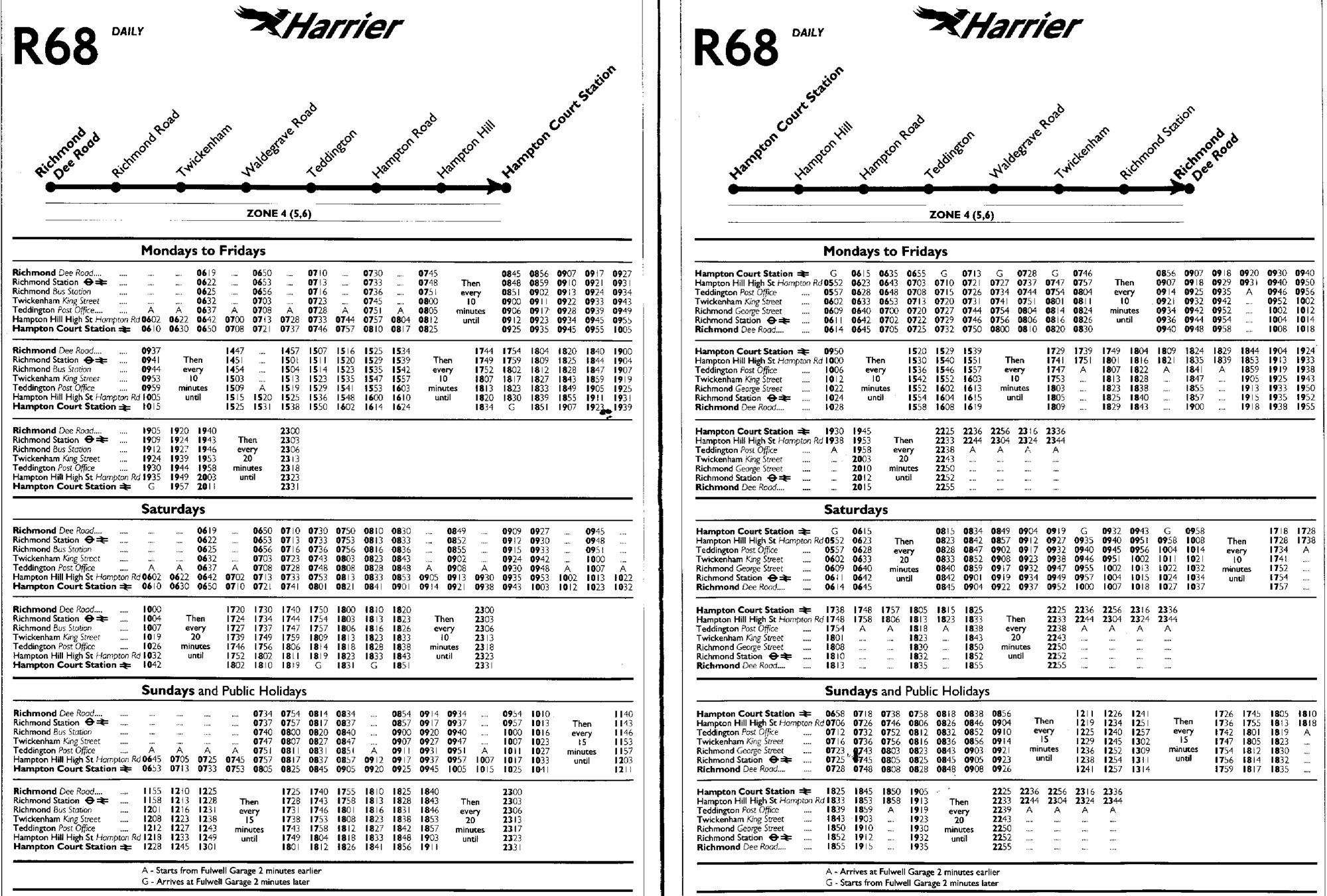 Withdrawn between Twickenham and Kew whilst road works are in place at Manor Circus, replaced by Revised R70