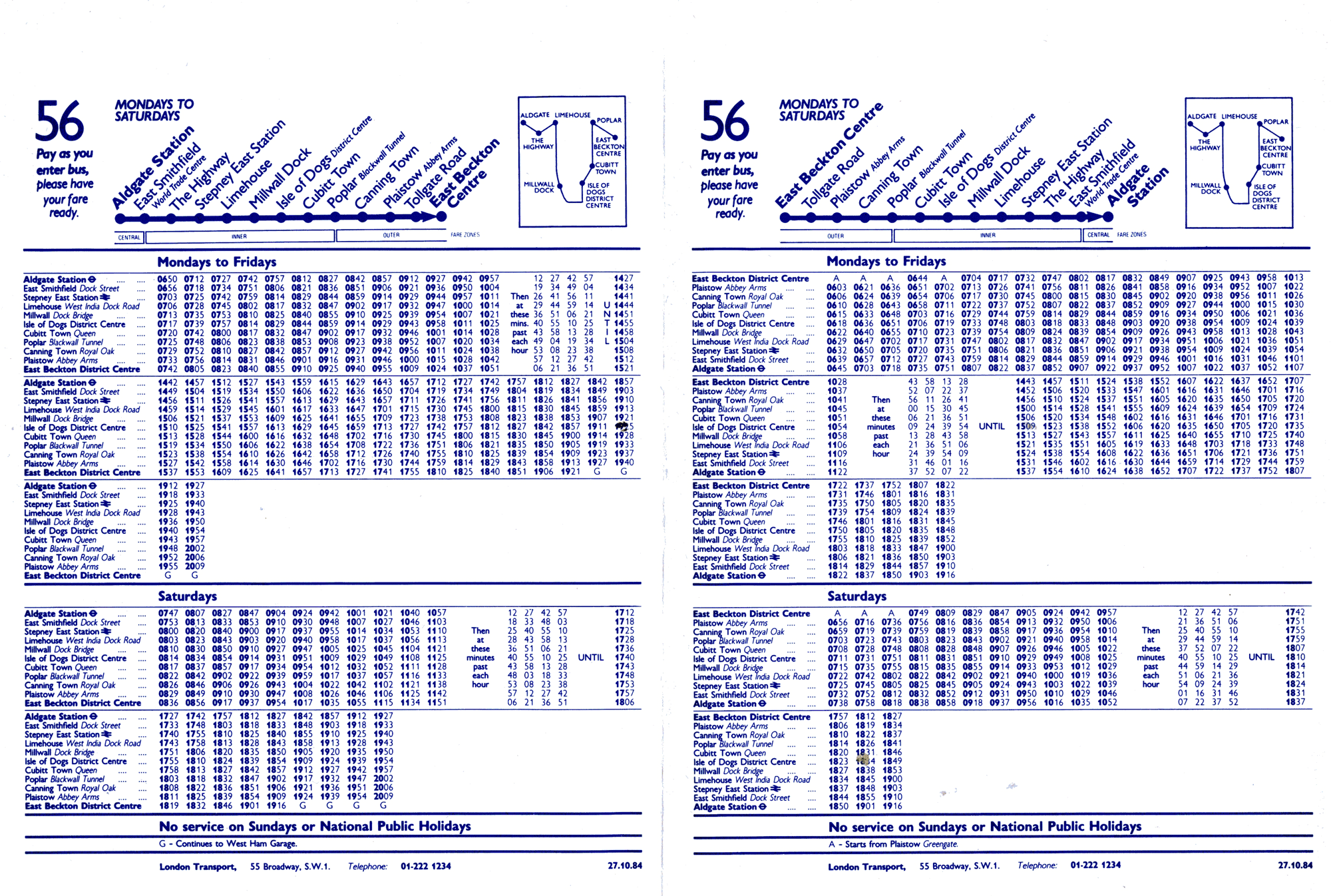 Dock - West Ferry Road - Cubitt Town - POPLAR Blackwall Tunnel ( Mon-Sat except evenings ) - East India Dock Road - LIMEHOUSE (Mon-Fri except peaks / Sat)