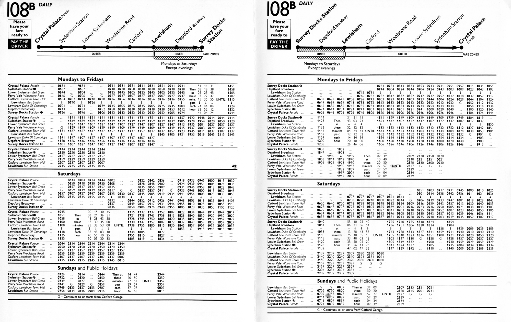 DOCKS STN (Mon-Fri peaks) - GREENWICH CHURCH (Mon-Sat / Sun late morning and early evening) - BLACKHEATH (Suns am late / evenings ) - CRYSTAL PALACE