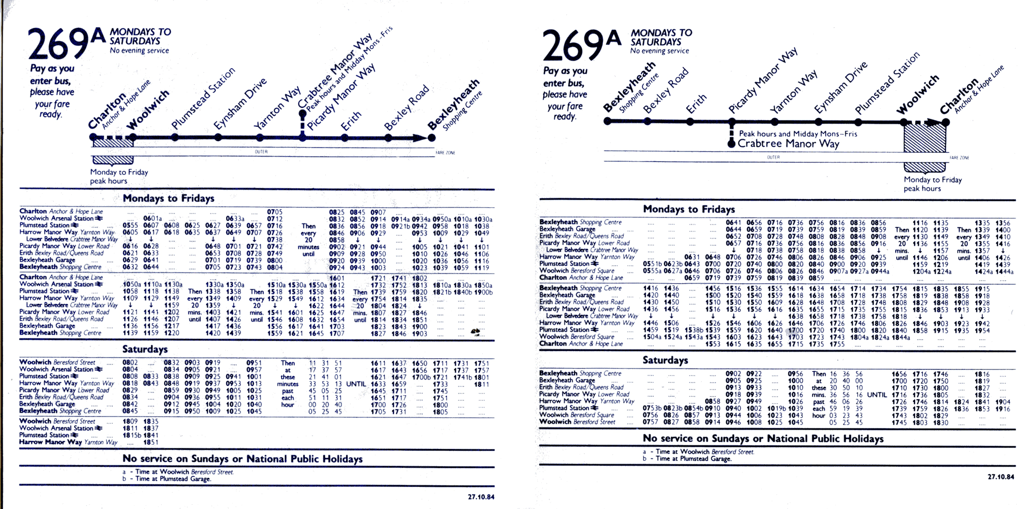 BEXLEYHEATH ( Mon-Sat except evenings ) - WOOLWICH ( Mon-Sat except evenings ) - CHARLTON ( Mon-Fri peaks )