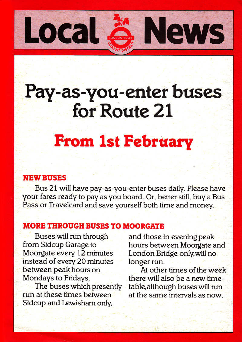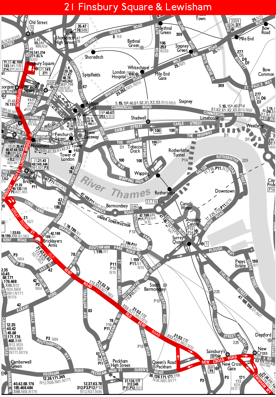 Holloway – Highbury – Hoxton – Moorgate – London Bridge – New Cross – Lewisham (Route 21)