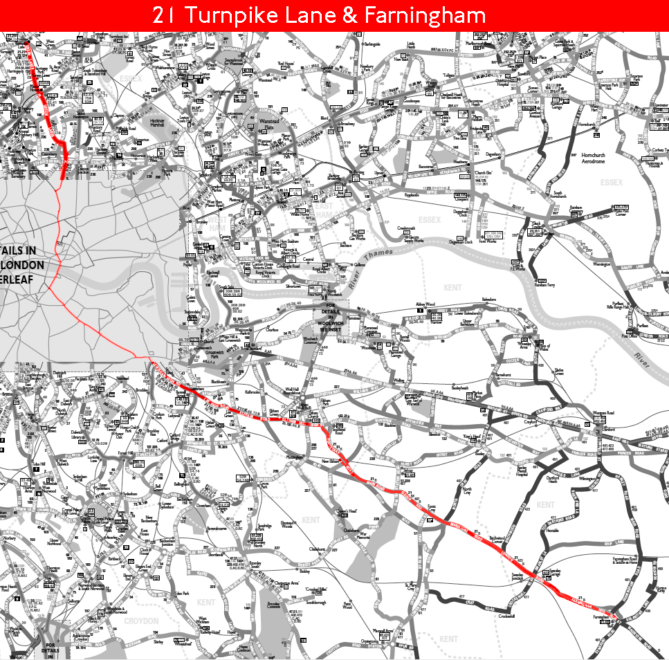 TURNPIKE LANE STATION - Green Lanes - Manor House - Newington Green - Hoxton - Old Street Stn - Moorgate - Bank - London Bridge - Borough - Great Dover Street - Bricklayers Arms - Old Kent Road - New Cross - Lewisham - Lee - Eltham - Sidcup - Foots Cray - Birchwood Corner - Swanley - FARNINGHAM Bull