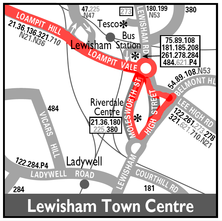 Lewisham Molesworth Street - Molesworth Street - Rennell Street - Lewisham High Street - Lewisham Road - Station Road - Lewisham Station - Loampit Vale - Loampit Hill - Lewisham Way - New Cross Road - New Cross Gate Station - New Cross Road - Old Kent Road - Bricklayer's Arms Roundabout - Great Dover Street - Borough Station - Borough High Street - London Bridge Station - London Bridge - King William Street - Monument Station - King William Street - Lombard Street - Bank Station - Princes Street - Moorgate - Moorgate Station - Finsbury Pavement - Finsbury Square - City Road - Old Street Station - City Road - Provost Street - Vestry Street - East Road - Hoxton - New North Road - Essex Road Station - Canonbury Road - Highbury Corner - Highbury & Islington Station - Holloway Road - Holloway Road Station - Holloway Road - Camden Road - Holloway Camden Road