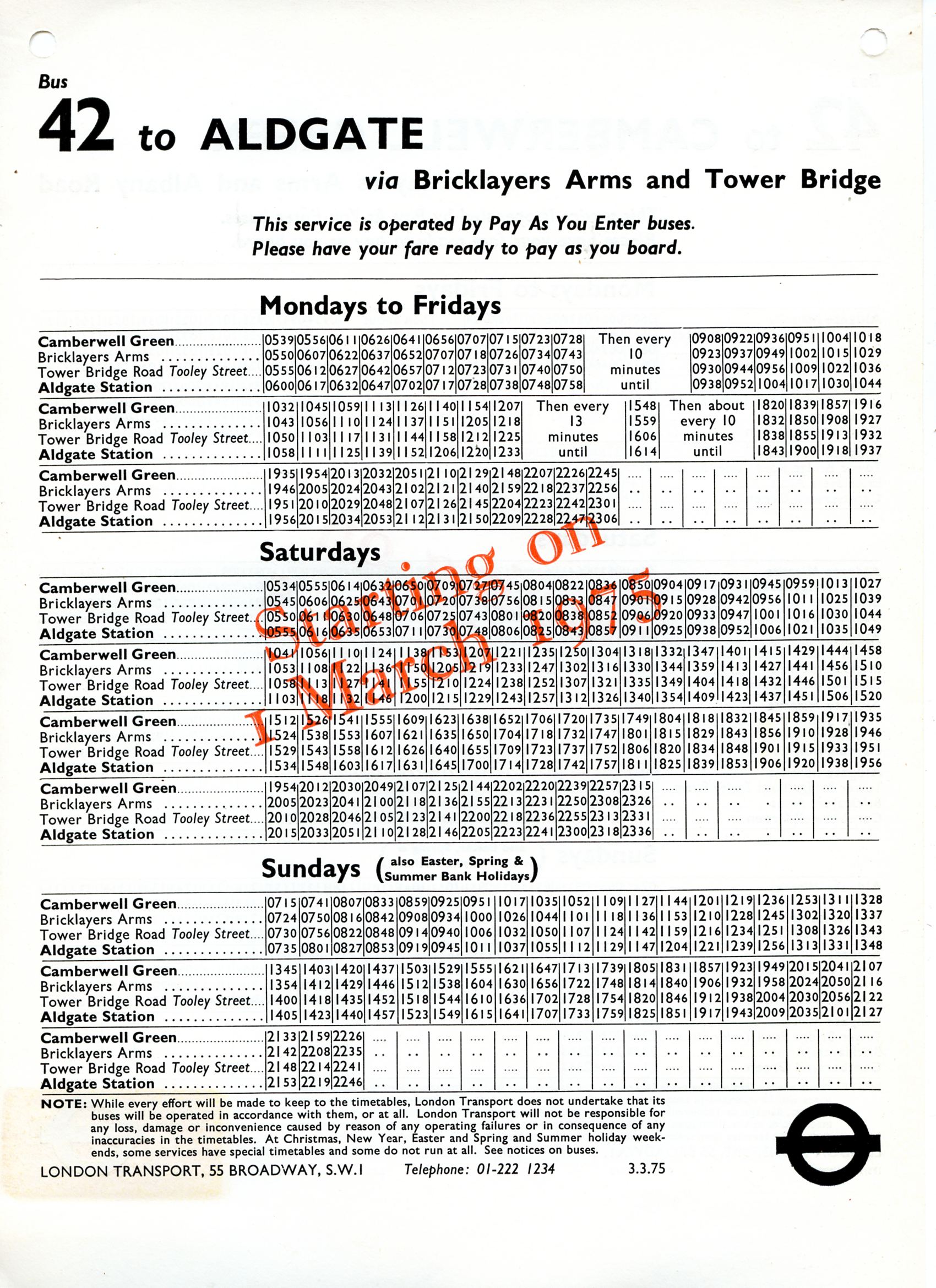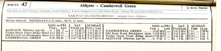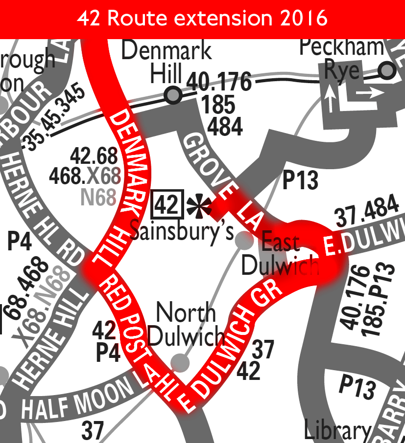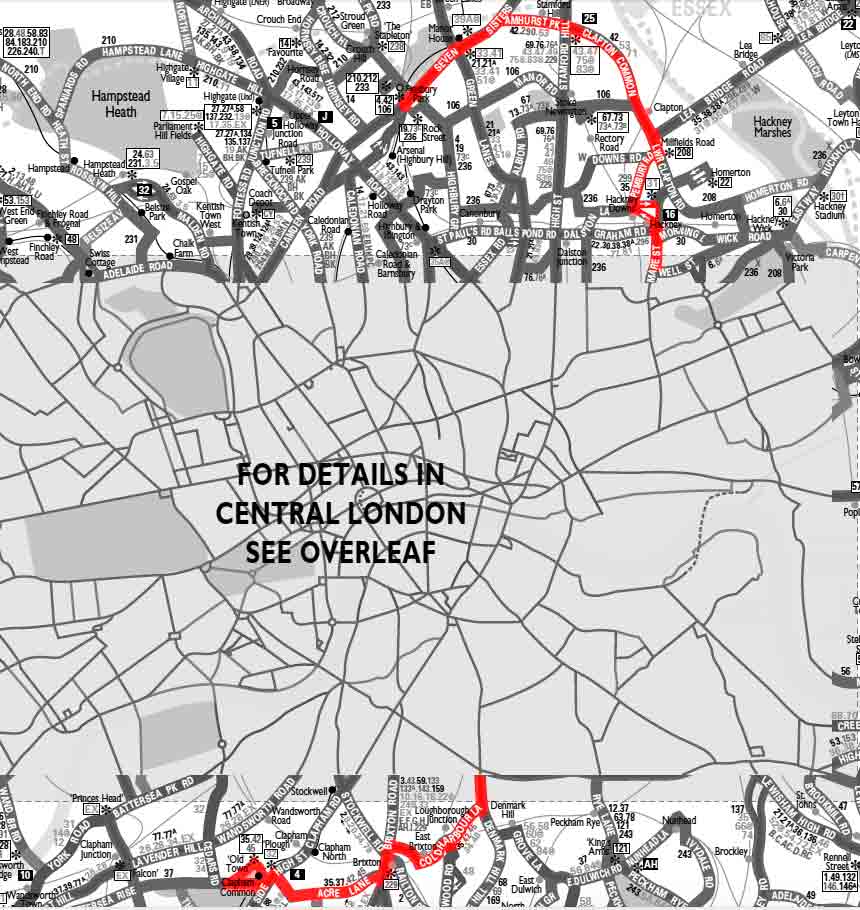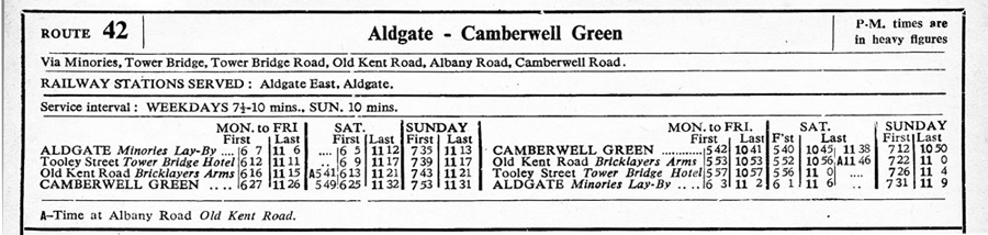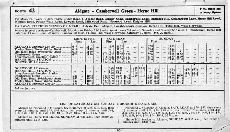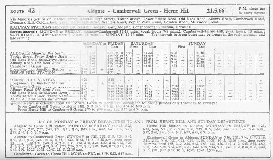 Sat afternoons extended from Camberwell Green to Clapham Common to compensate for Route 42A withdrawal