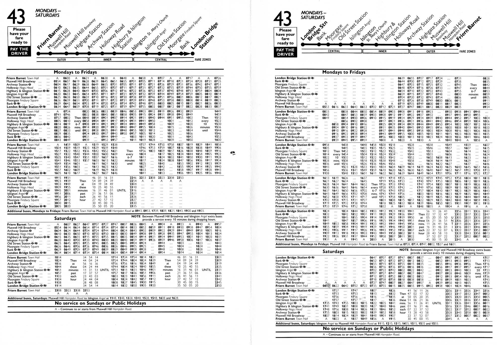 Sunday service withdrawn - replaced by Route 43A which ran from Friern Barnet to Croydon Airport.