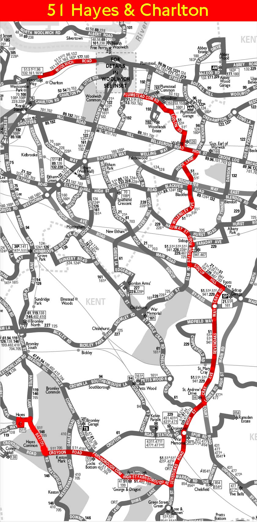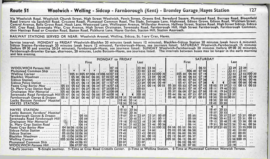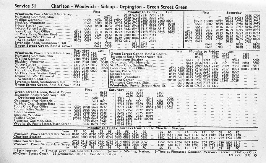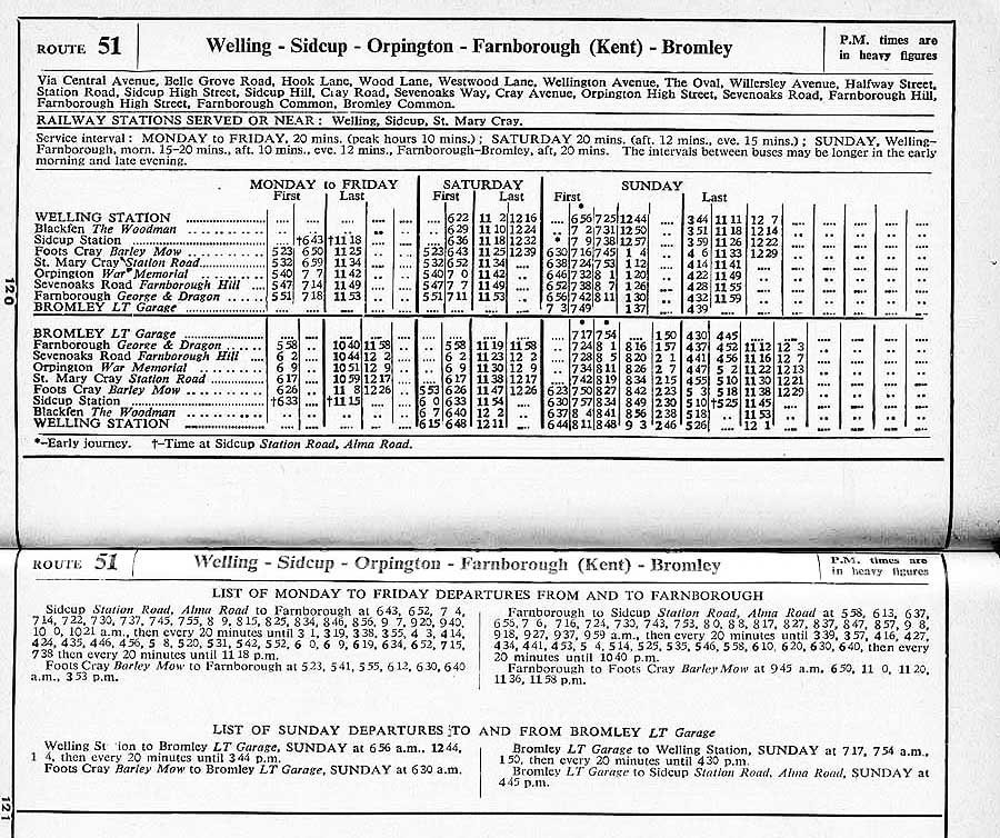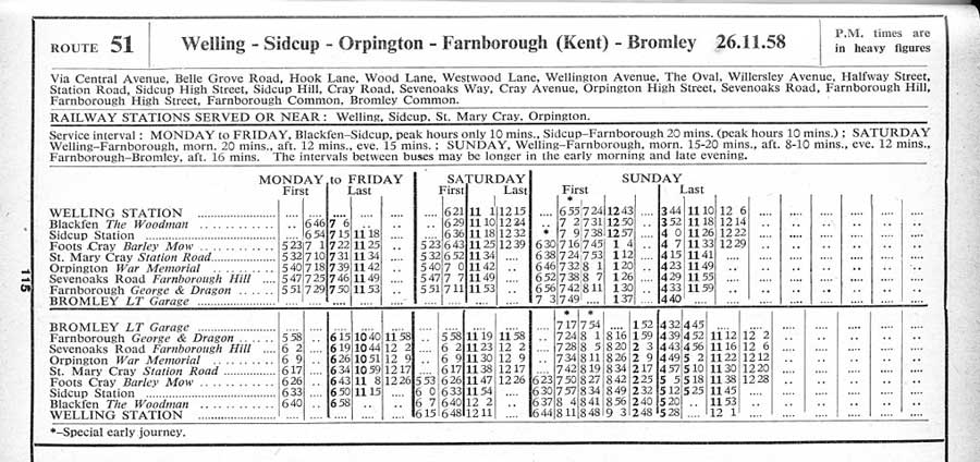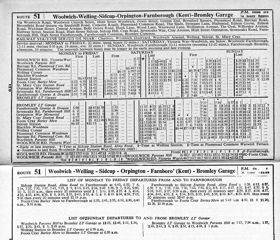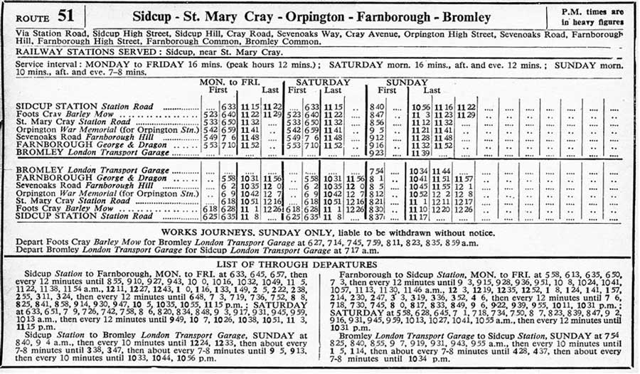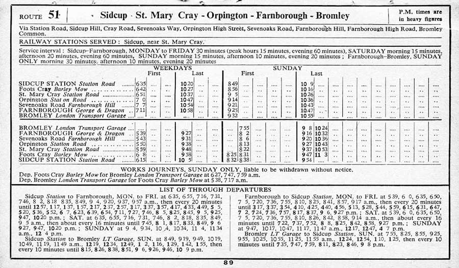 STATION (Sat/Sun) - BLACKFEN (Mon-Fri peaks) - SIDCUP STN (Mon-Fri) - FARNBOROUGH - BROMLEY GARAGE (Sun afts)