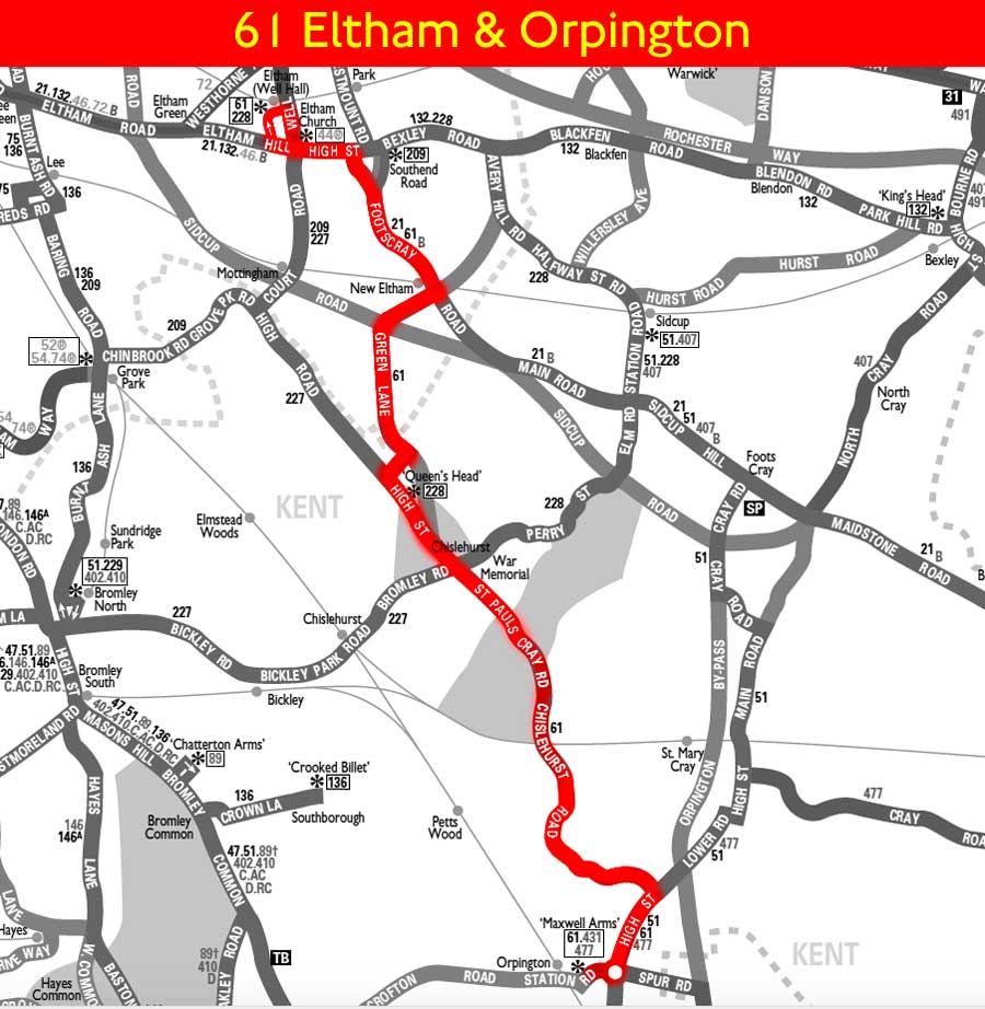 Monday-Saturday withdrawn between Chislehurst and Eltham replaced by new 61B Route.