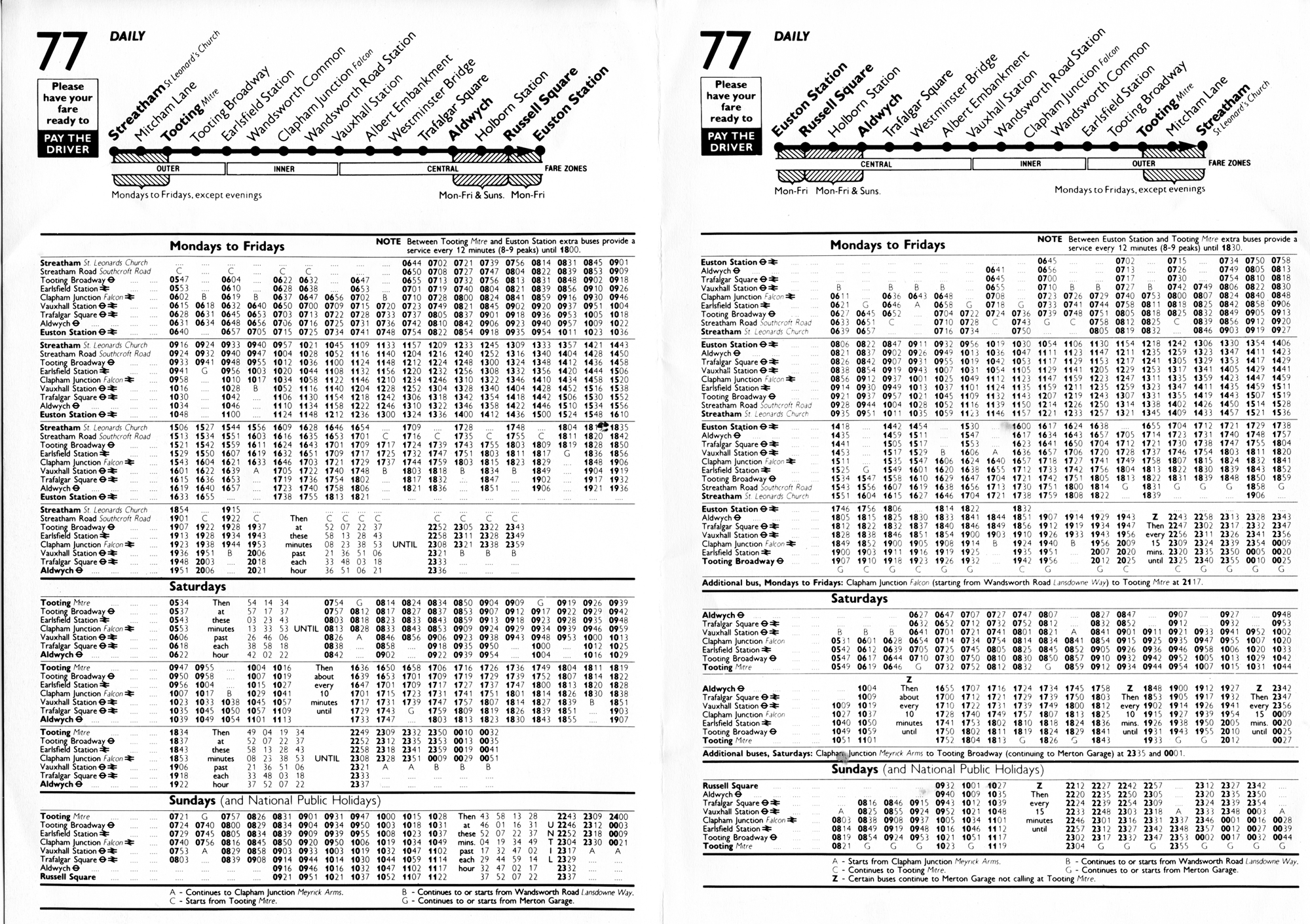 EUSTON (Mon-Fri except evgs) - Russell SQUARE (Suns) - ALDWYCH (Mon-Fri evgs/Sat) - TOOTING Mitre