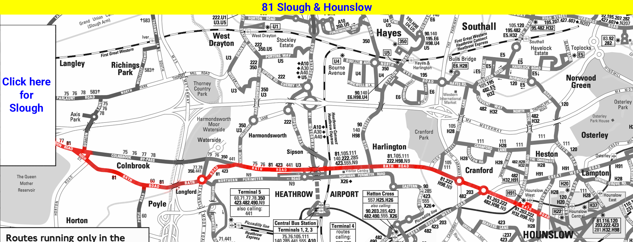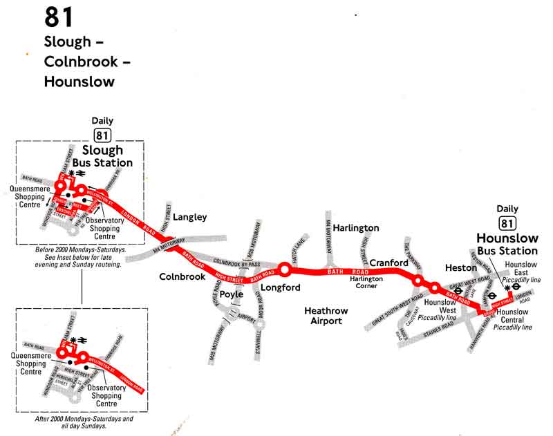 HOUNSLOW - SLOUGH ( Mon-Fri/ Sat am) - WINDSOR CASTLE ( Sat pm /Sun ) or CRANFORD Queens Head ( Mon-Sat journeys / Sun evenings)