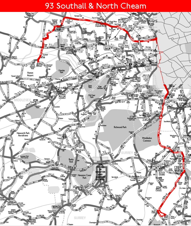 - Somerset Road - Allenby Road - Ruislip Road - Greenford - Western Avenue - Perivale - Park Royal Stn - North Acton - East Acton - Westway - Wood lane - Shepherds Bush - Hammersmith - Fulham Palace Road - Fulham High Street - Putney Bridge - Putney High Street - Putney Hill - Putney Heath - Parkside - Wimbledon Village - Wimbledon Station - South Wimbledon Stn- MORDEN STATION ( Mon-Fri ) - Stonecot Hill - NORTH CHEAM Priory Road ( Mon-Fri peaks / Sat / Sun )