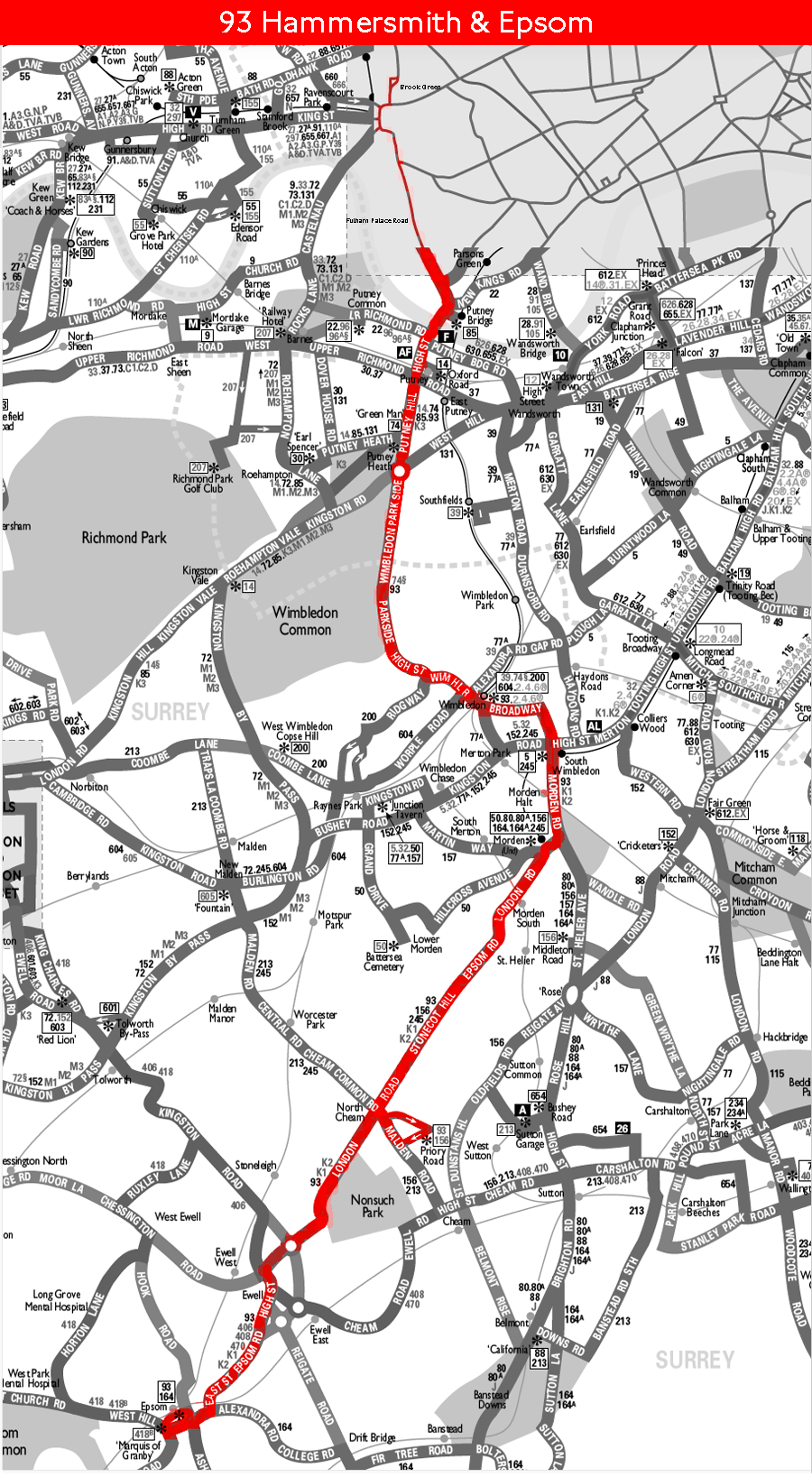 North Cheam – Morden – Wimbledon – Wimbledon Common – Putney Heath – Putney