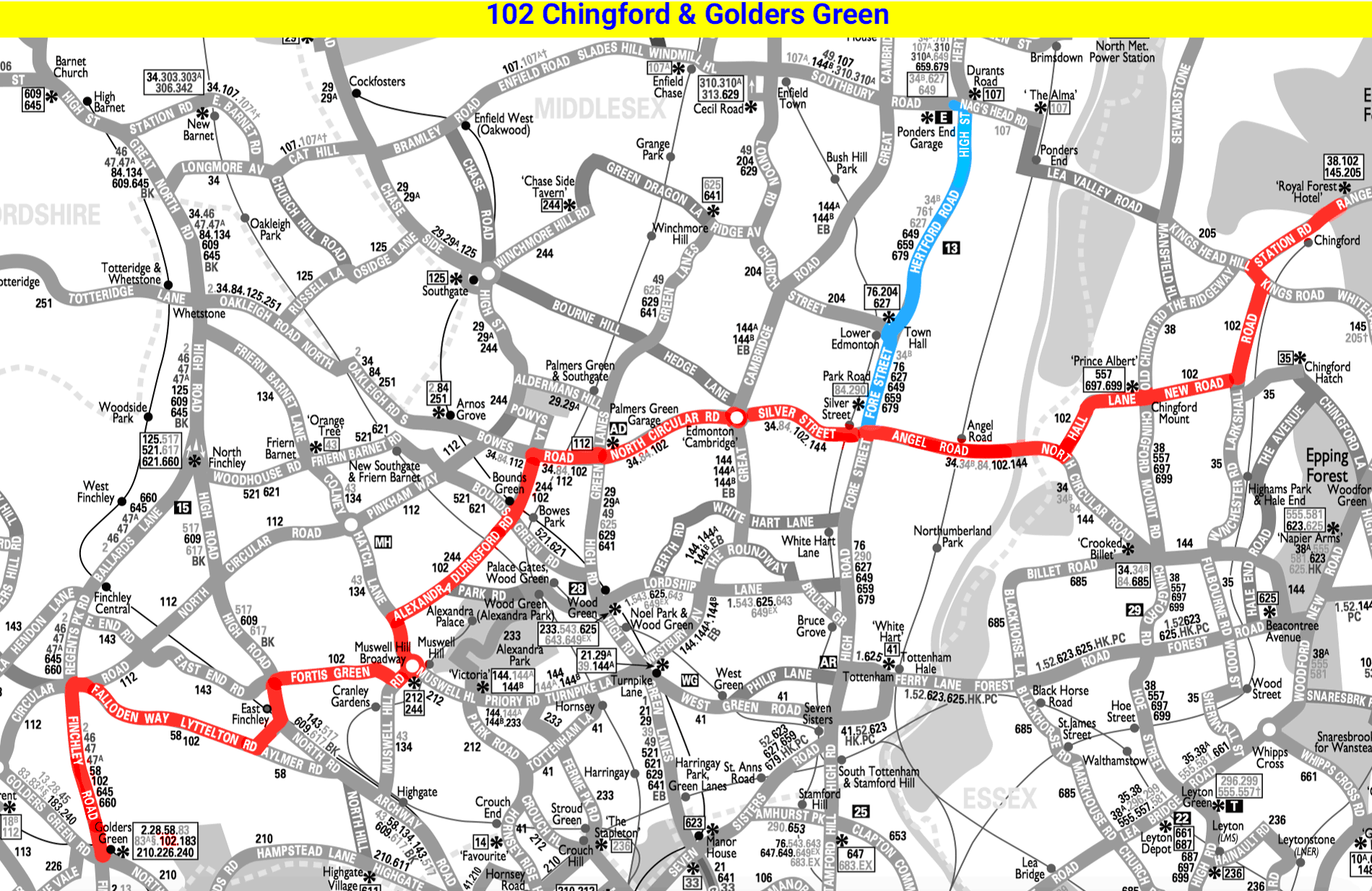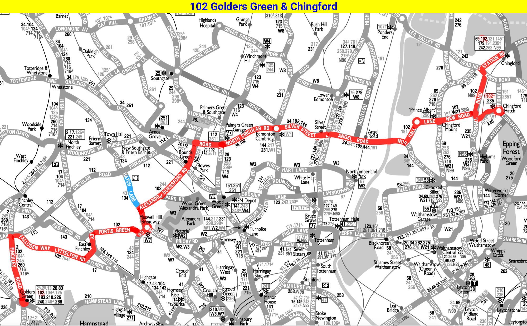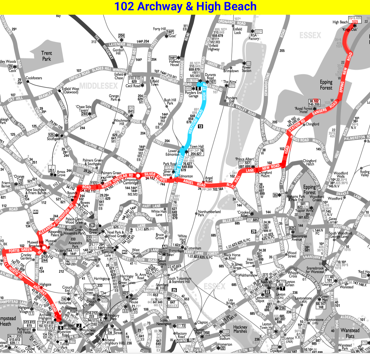 ARCHWAY STATION - Highgate Hill - East Finchley - Fortis Green - Muswell Hill - CHINGFORD Royal Forest Hotel ( Mon-Sat ) - Rangers Road - Epping New Road - HIGH BEACH Kings Oak ( Summer Sundays )