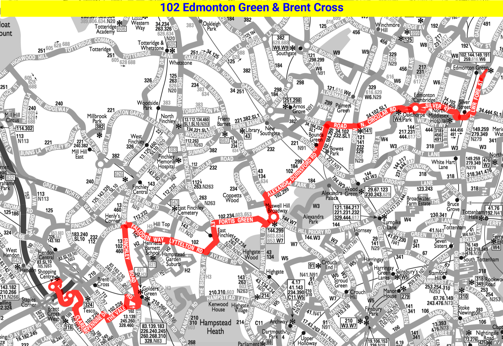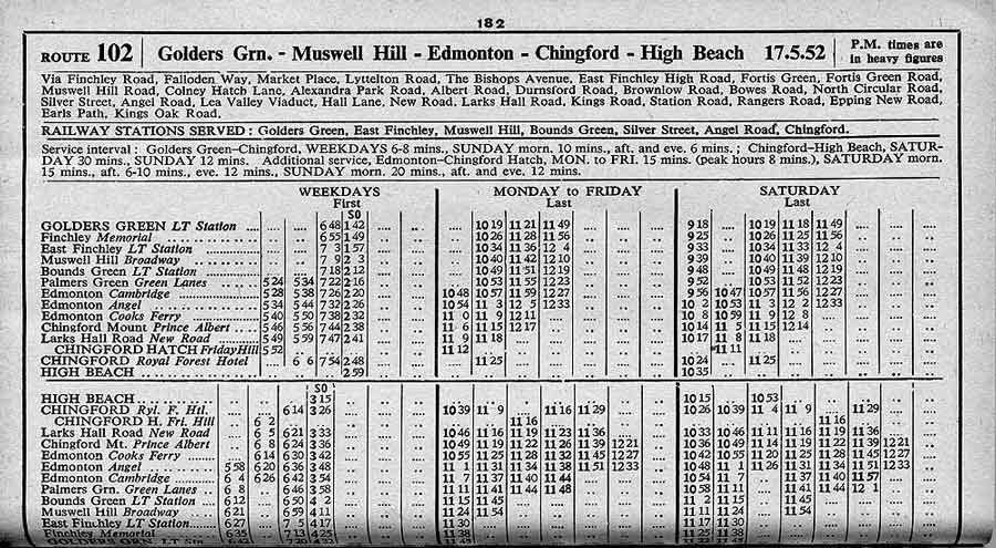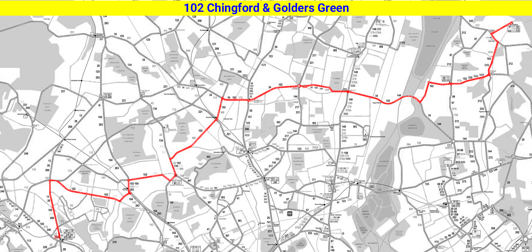 ARCHWAY STATION - Highgate Hill - East Finchley - Fortis Green - Muswell Hill - CHINGFORD Royal Forest Hotel ( Mon-Sat ) - Rangers Road - Epping New Road - HIGH BEACH Kings Oak ( Summer Sundays )