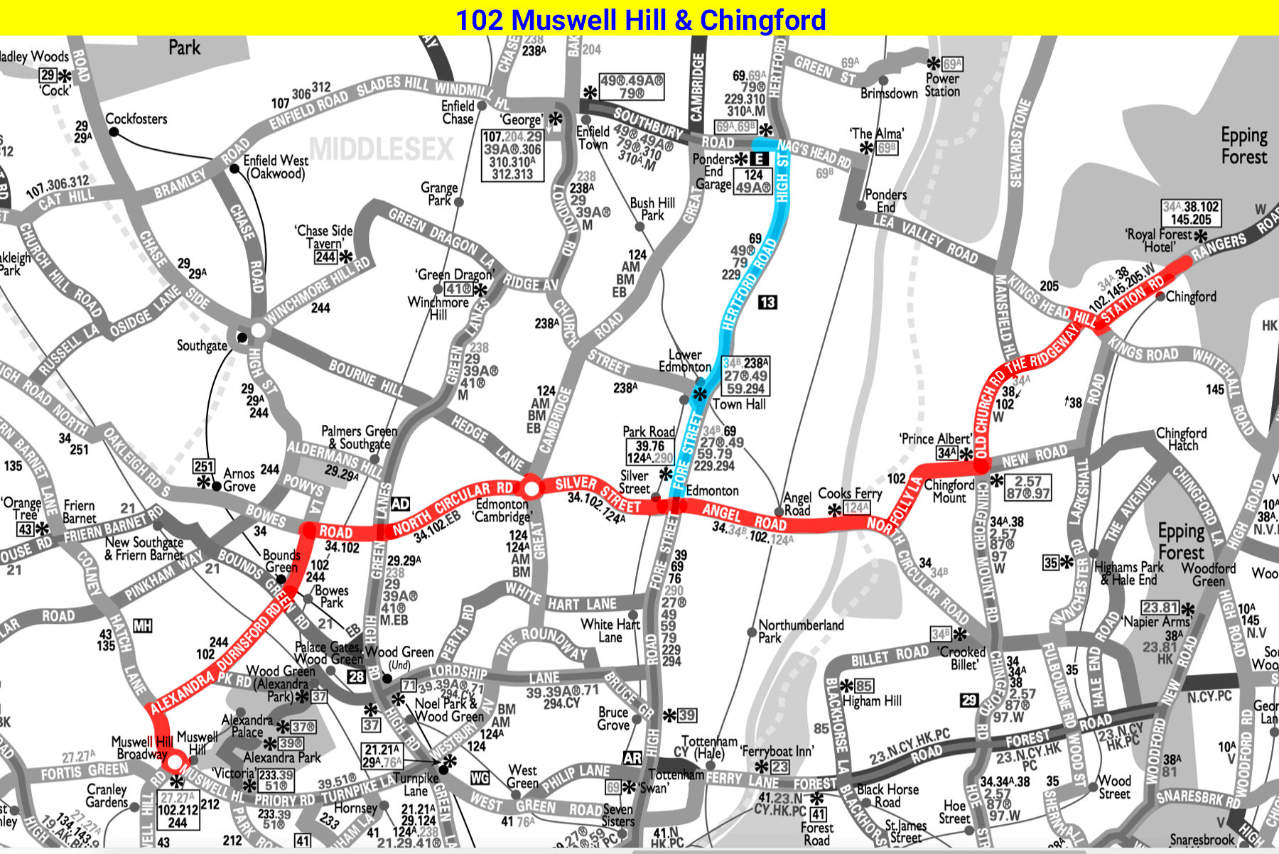 MUSWELL HILL BROADWAY - Colney Hatch Lane - Alexandra Park Road - Bowes Park - Palmers Green - North Circular Road - Edmonton - Hall Lane - Chingford Mount - Old Church Road - The Ridgeway - Station Road - CHINGFORD Royal Forest Hotel