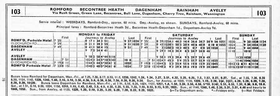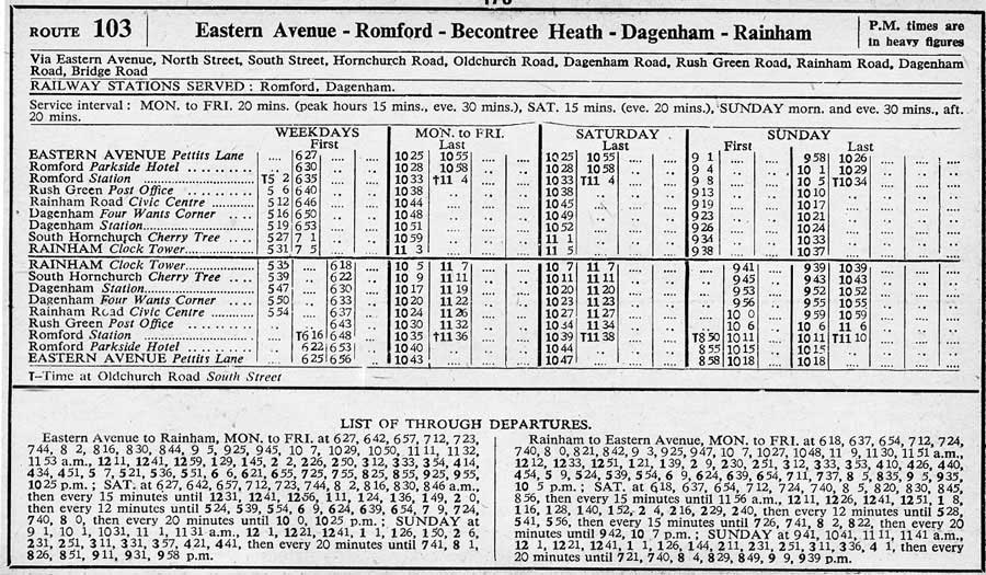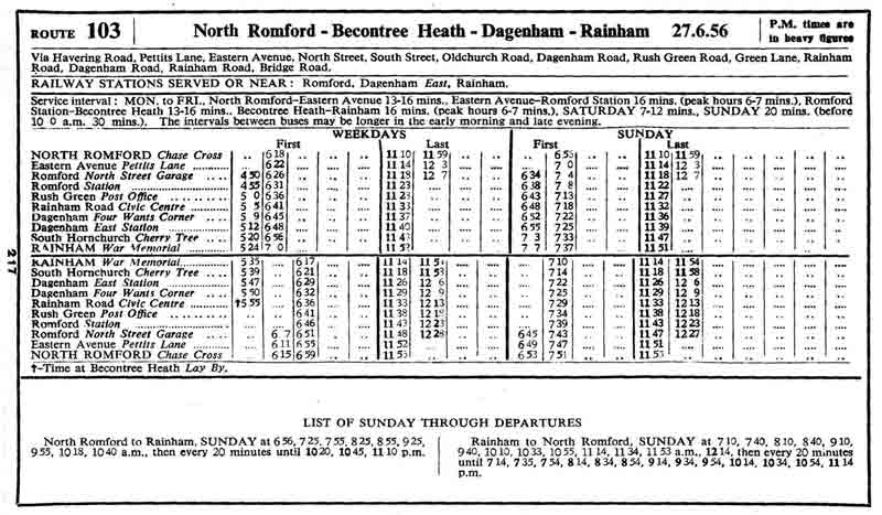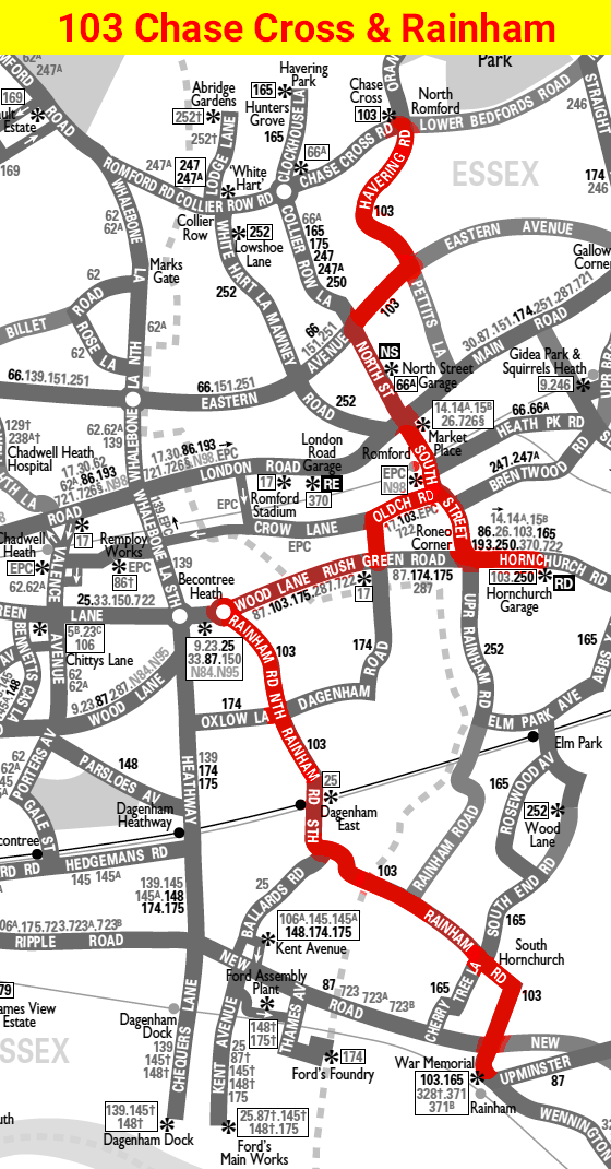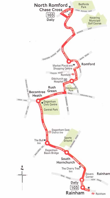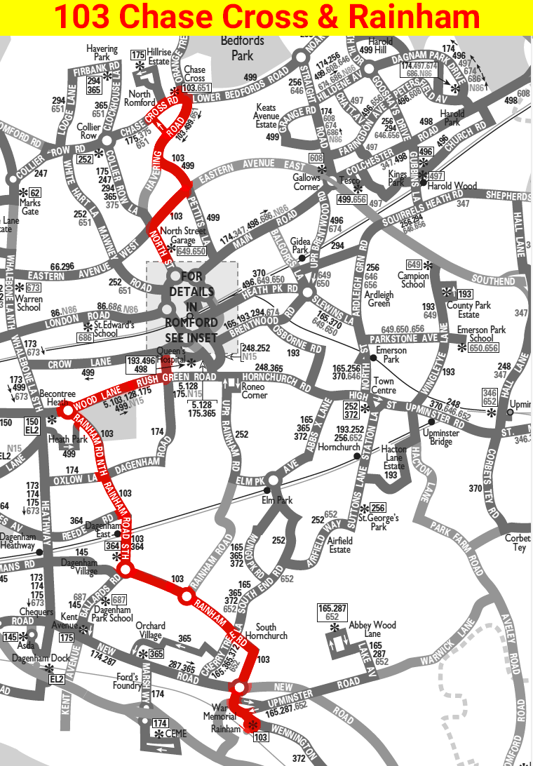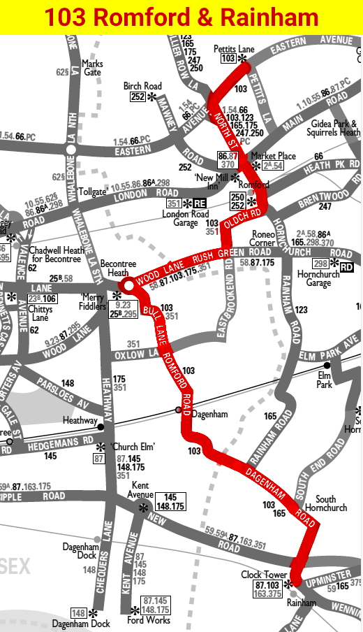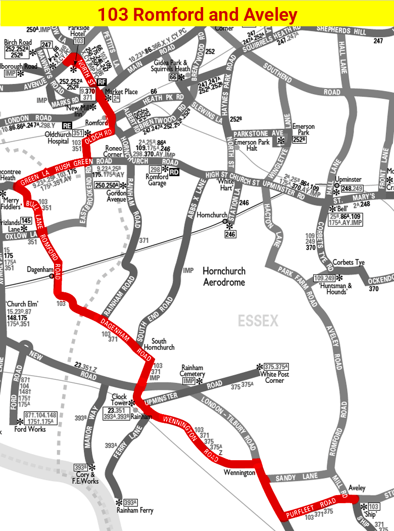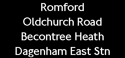 ROMFORD Parkside Hotel– Romford – Oldchurch Road– Becontree Heath. – Rainham Road – DAGENHAM EAST The Bull -: Rainham - Wennington - AVELEY Prince Albert ( Daily irregular journeys )