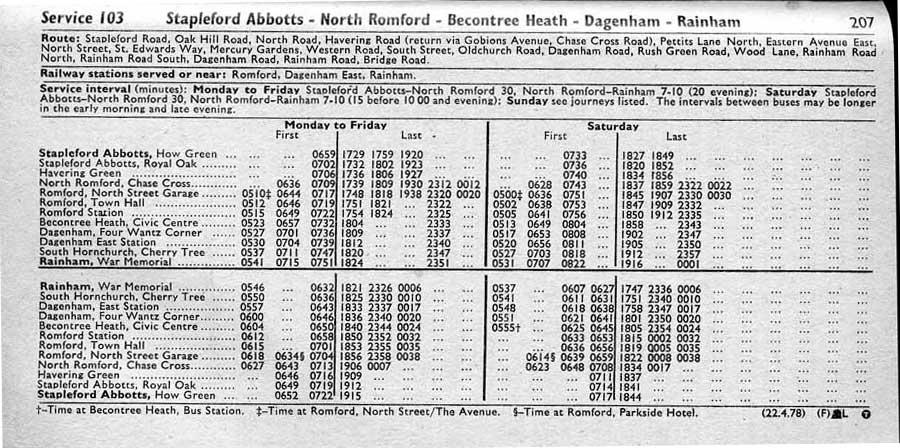 GALLOW CORNER ( Mon-Sat ) - ROMFORD Parkside Hotel ( Suns ) - RAINHAM War Memorial