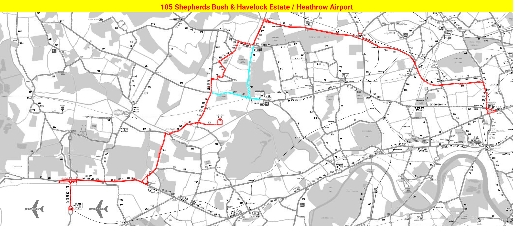 SHEPHERDS BUSH Wells Road - Wood Lane - White City - Westway - East Acton - Western Avenue - North Acton - Park Royal Station - Hanger Lane Stn - Perivale - Greenford - Ruislip Road - Mornington Road -Somerset Road - Allenby Road - North Road - Carlyle Avenue - Southall - Norwood Green - Heston - Lampton Corner - Bell Corner - Staines Road - HOUNSLOW HEATH