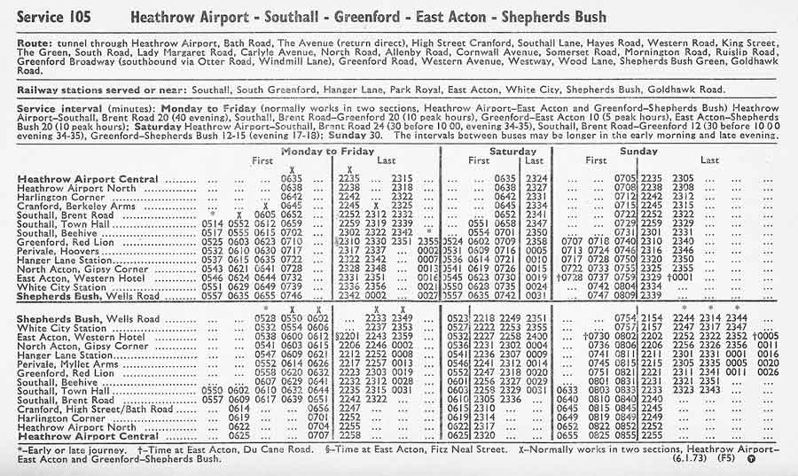 WANDSWORTH BRIDGE Tavern ( Mon-Sat ) - SHEPHERDS BUSH Wells Road ( Suns ) - SOUTHALL Brent Road ( Mon-Sat ) - HOUNSLOW HEATH ( Suns )