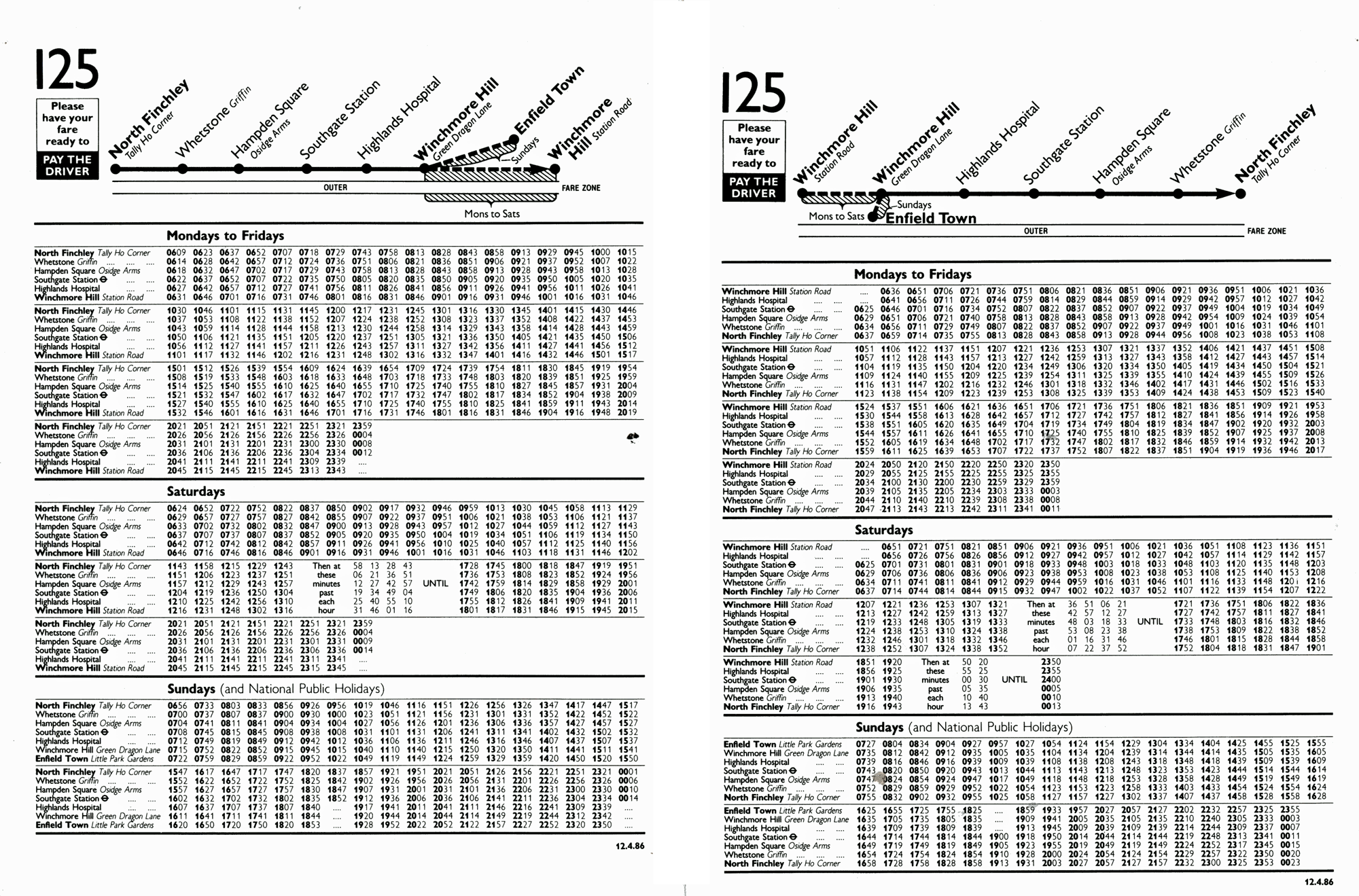 evgs) - NORTH FINCHLEY (Mon-Fri evgs,Sat/Sun) - SOUTHGATE ( Mon-Sat ) - HIGHLANDS HOSPITAL (MS peaks) - WINCHMORE HILL (Suns)