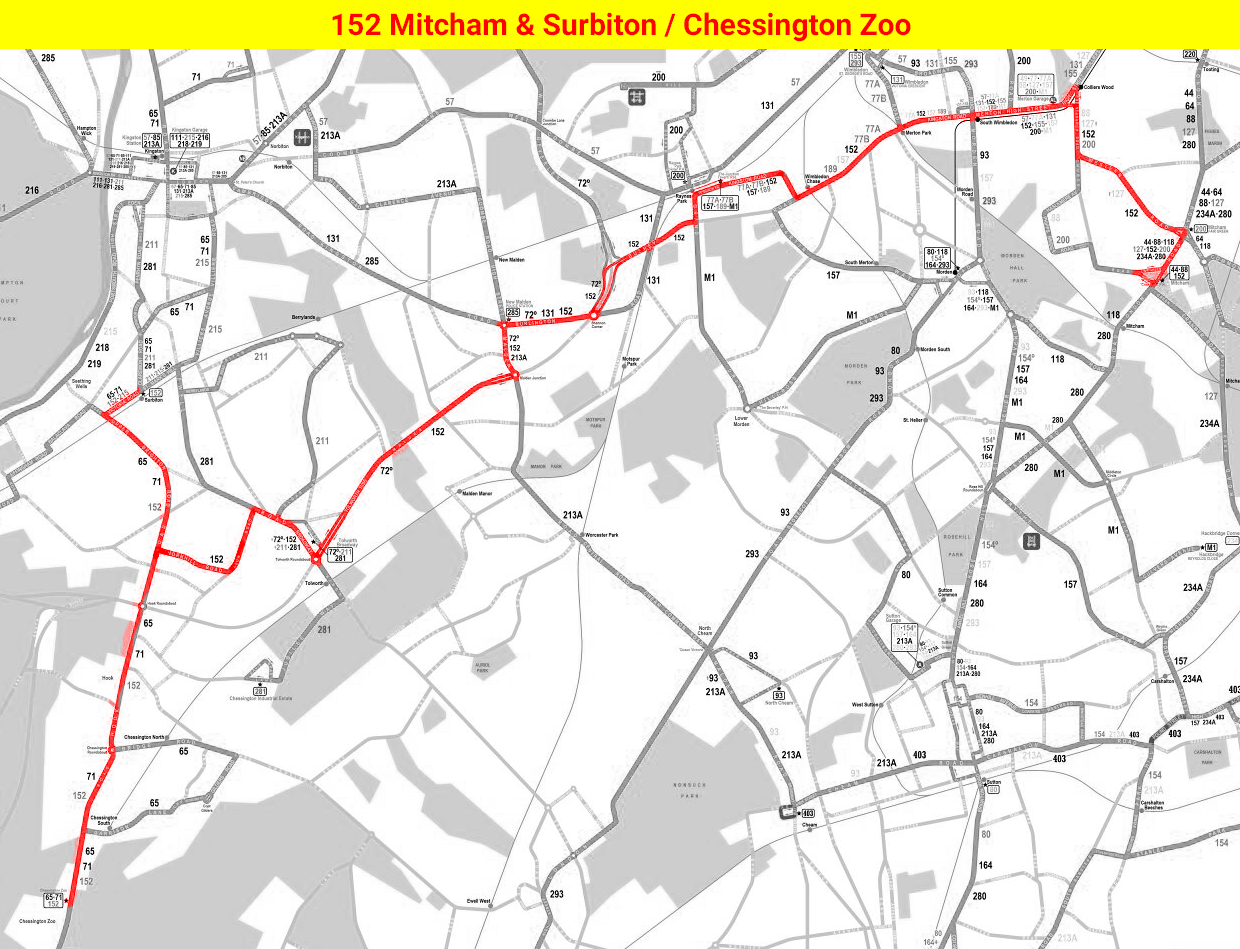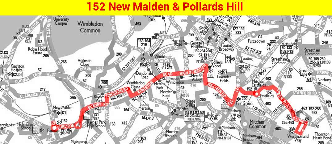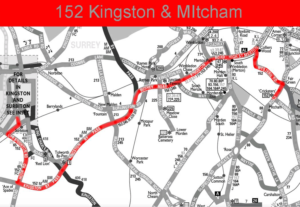 MITCHAM Cricketers - Fair Green - Western Road - Colliers Wood - Merton - South Wimbledon - Wimbledon Chase - New Malden - Tolworth - Hook - Upper Brighton Road - Victoria Road - Surbiton Station - Villiers Road - KINGSTON BUS STATION