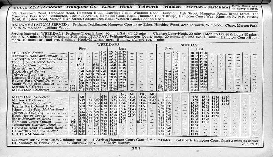 MITCHAM - HAMPTON COURT ( Mon-Fri evgs / Suns ) - TEDDINGTON ( Mon-Fri daytime / Sat ) - FELTHAM ( Mon-Fri peaks)