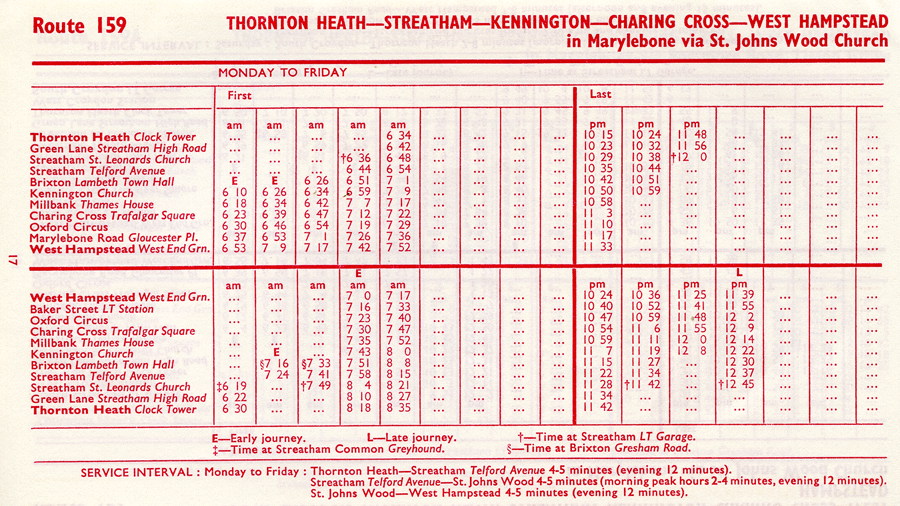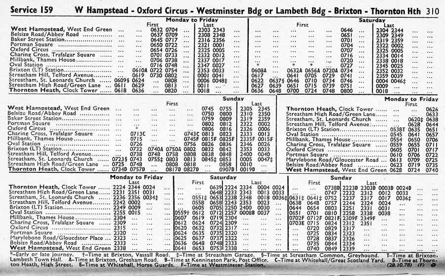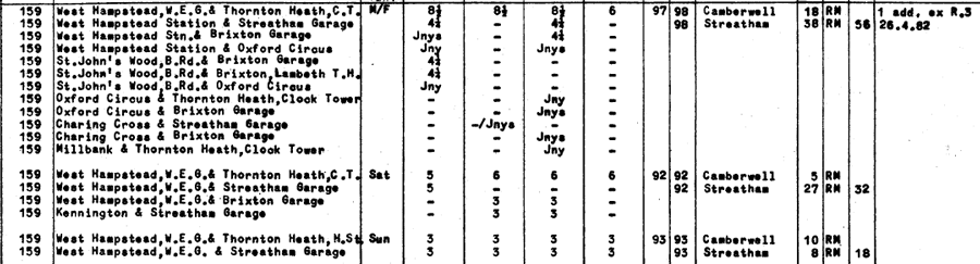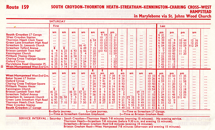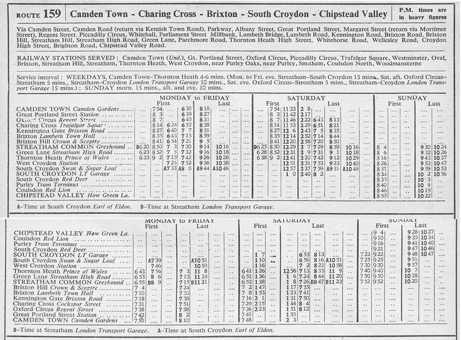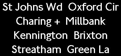 CAMDEN TOWN ( Mon-Fri except evenings / Sat am) - OXFORD CIRCUS ( Sat afternoons ) - STREATHAM COMMON ( Mon-Sat evenings / Suns ) - THORNTON HEATH Clock Tower -