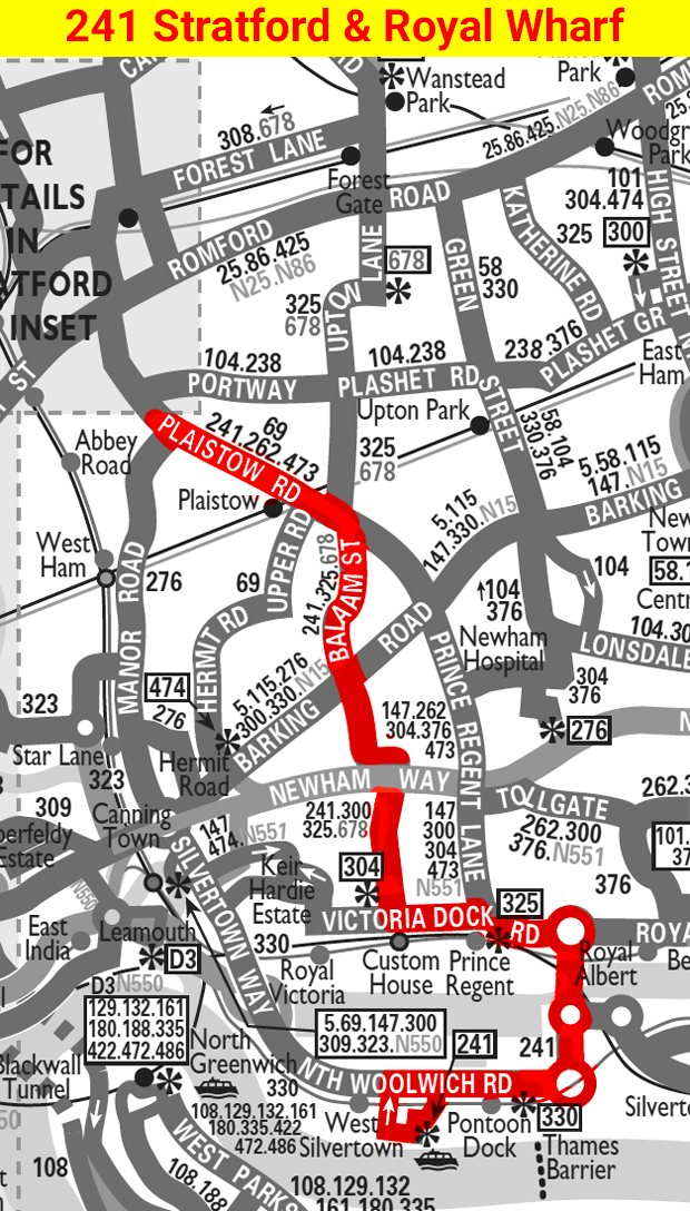 Temporary withdrawn between Prince Regent & Canning Town - a special free service 541 provided replacement between Canning Town & Keir Hardie Estate