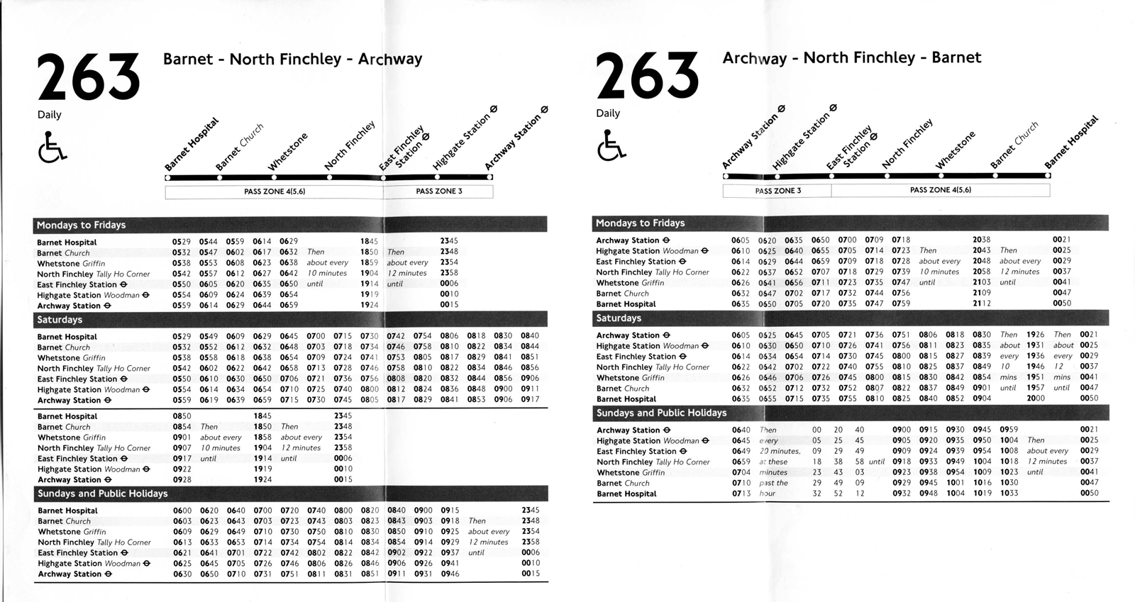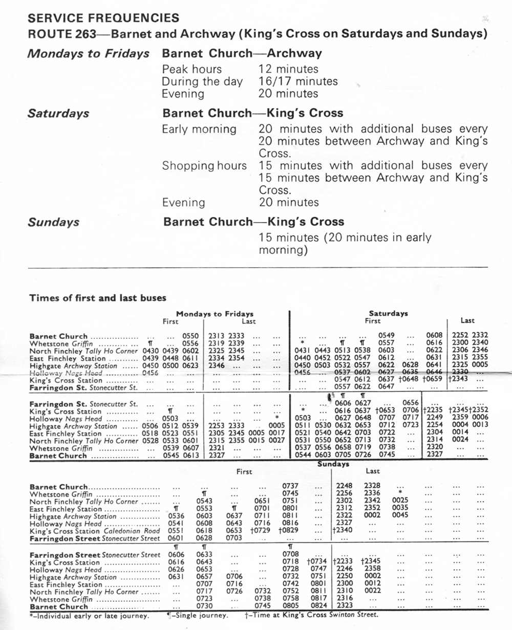BARNET High Street - North Finchley - East Finchley - ARCHWAY STN (Mon-Fri )- HOLLOWAY Nags Head (Mon-Fri early am jny) Caledonian Road - KINGS CROSS (Sat/Sun) Grays Inn Road - FARRINGDON STREET (Sat/Sun early jnys)