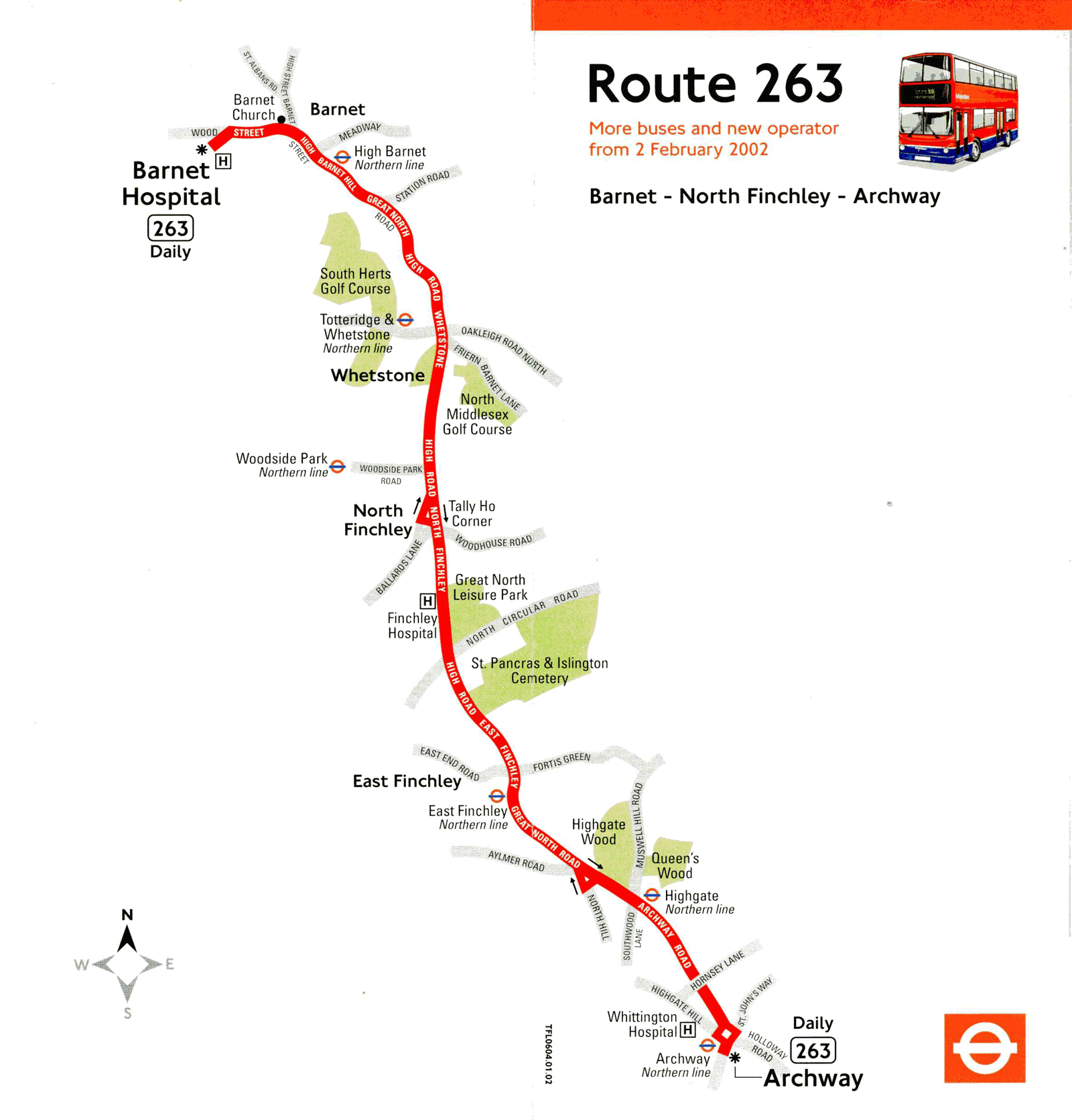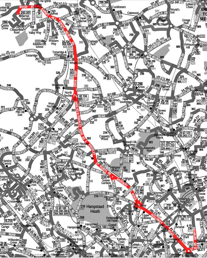 Re-routed to run between Highbury Barn and Barnet Hospital via Highgate Village (North Hill and Highgate Hill).