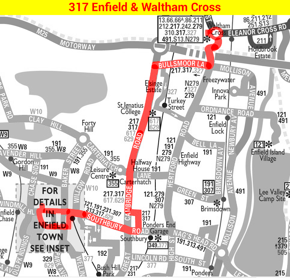 WALTHAM CROSS - Great Cambridge Road then via 217 to TURNPIKE LANE STATION