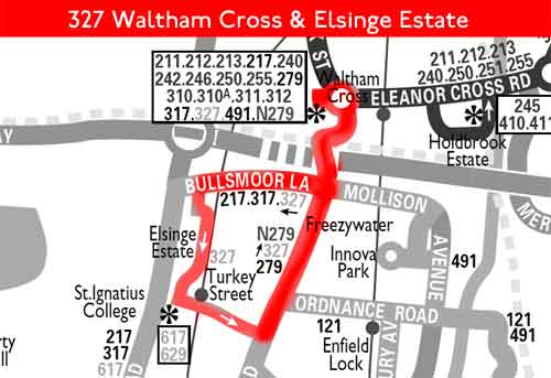 Waltham Cross Bus Station - Eleanor Cross Road - Monarch's Way - High Street - Hertford Road - Bullsmoor Lane - Lackmore Road - Marryat Road - Elsinge Road - Elsinge Estate - Turkey Street - Turkey Street Station - Turkey Street - Enfield Wash - Hertford Road - High Street - Monarch's Way - Eleanor Cross Road -