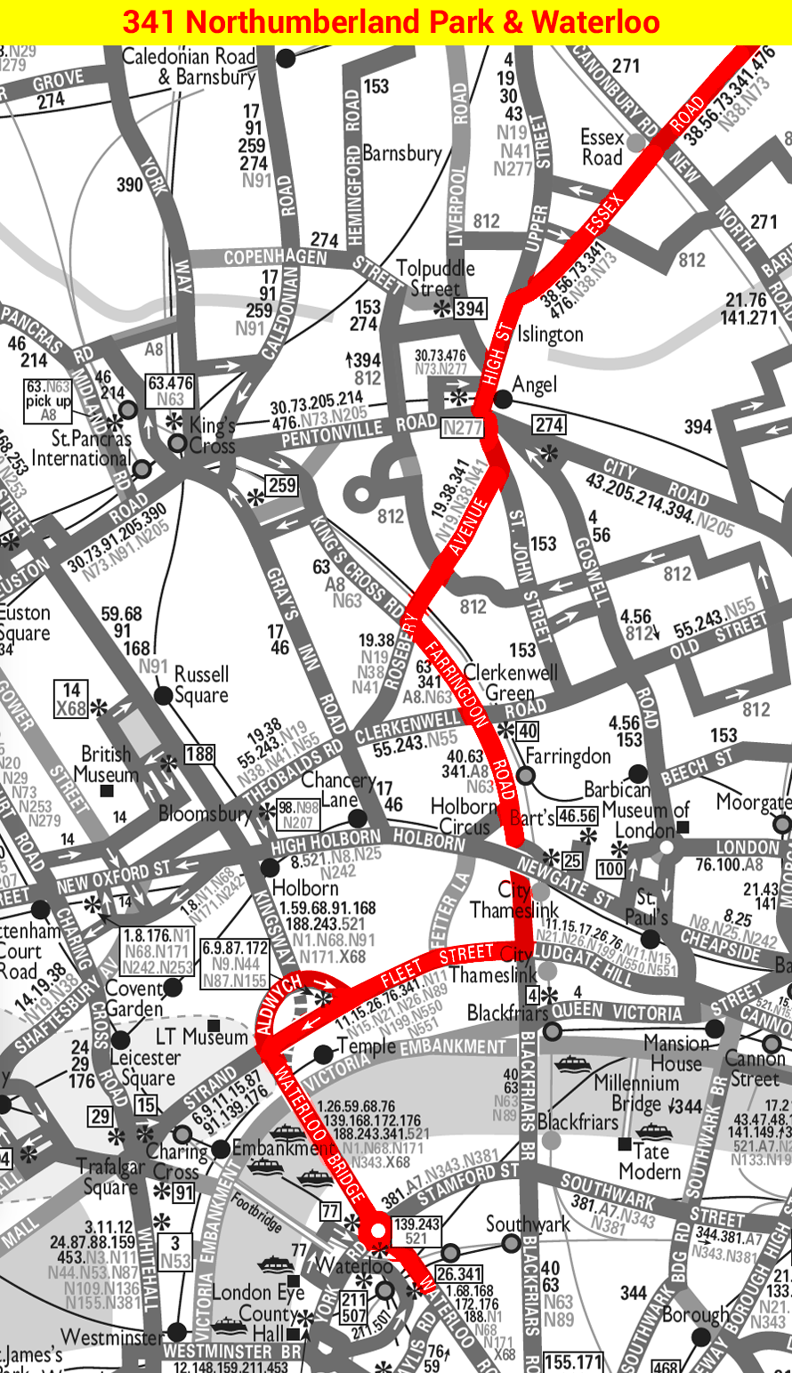 Diverted between Roseberry Avenue and Aldwych via Farringdon Road, Ludgate Circus and Fleet Street instead of New Fetter Lane which was left unserved