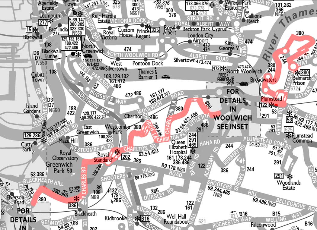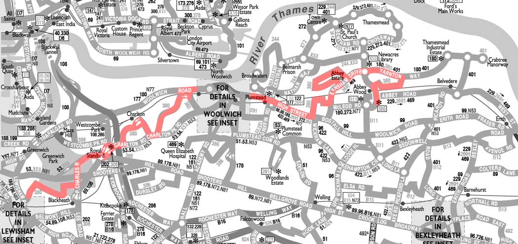LEWISHAM Riverdale Centre - Lewisham High Street - Lewisham Road - Lewisham Hill - Wat Tyler Road - Hare & Billet Road - Duke Humphrey Road - Long Pond Road - Prince Charles Road - Vanburgh Park - Royal Standard - Charlton Road - Charlton Park Road - Charlton Park Lane - Charlton Lane - Thorntree Road - Woodlands Terrace - Prospect Vale - Woolwich - Plumstead High Sreet - Plumstead Station - Church Manor Way - Blithdale Road - Woodhurst Road - Manton Road - Basildon Road - Eynsham Drive - Finchdale Road - Church Manorway - Sewell Road - Grovebury Road - Eynsham Drive - Harrow Manorway - ABBEY WOOD STATION ( Mon-Sat except evenings )