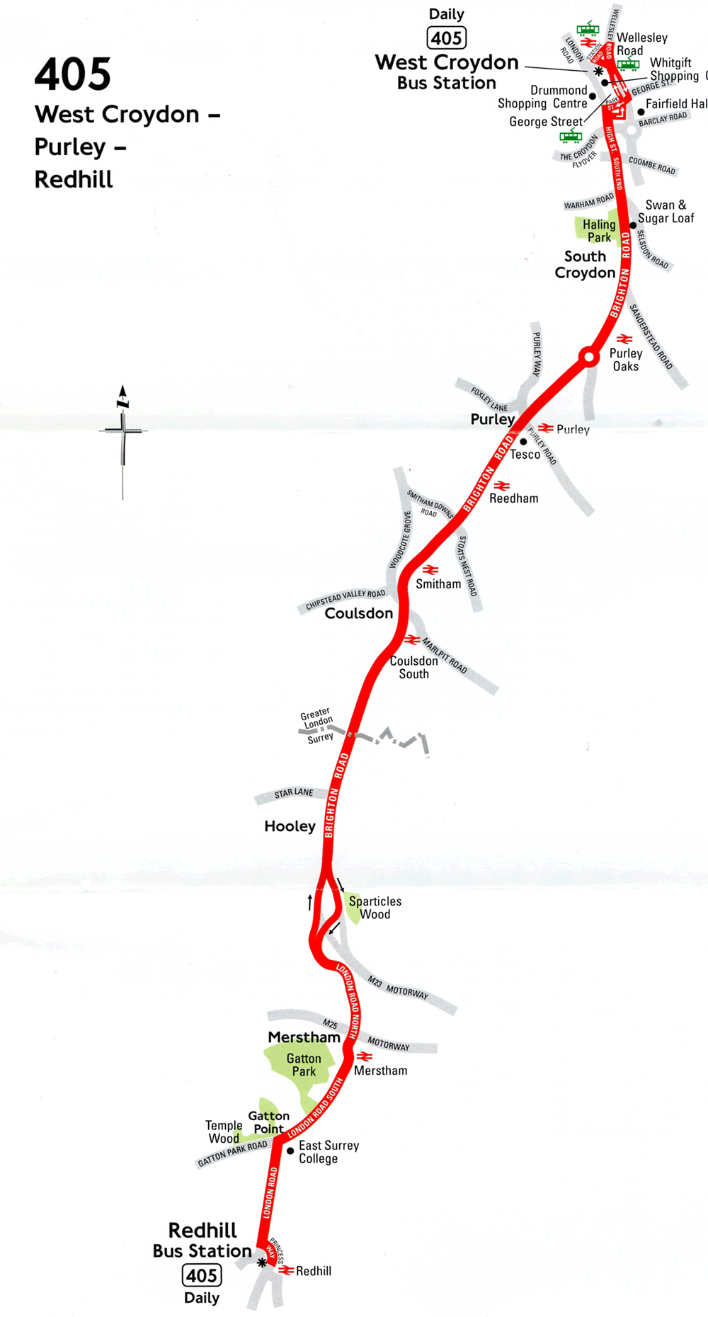 REDHILL Bus Station - London Road - Gatton Point - Hooley - Brighton Road - Coulsdon - Purley - South Croydon - South End - Wellesley Road - WEST CROYDON Bus Station.