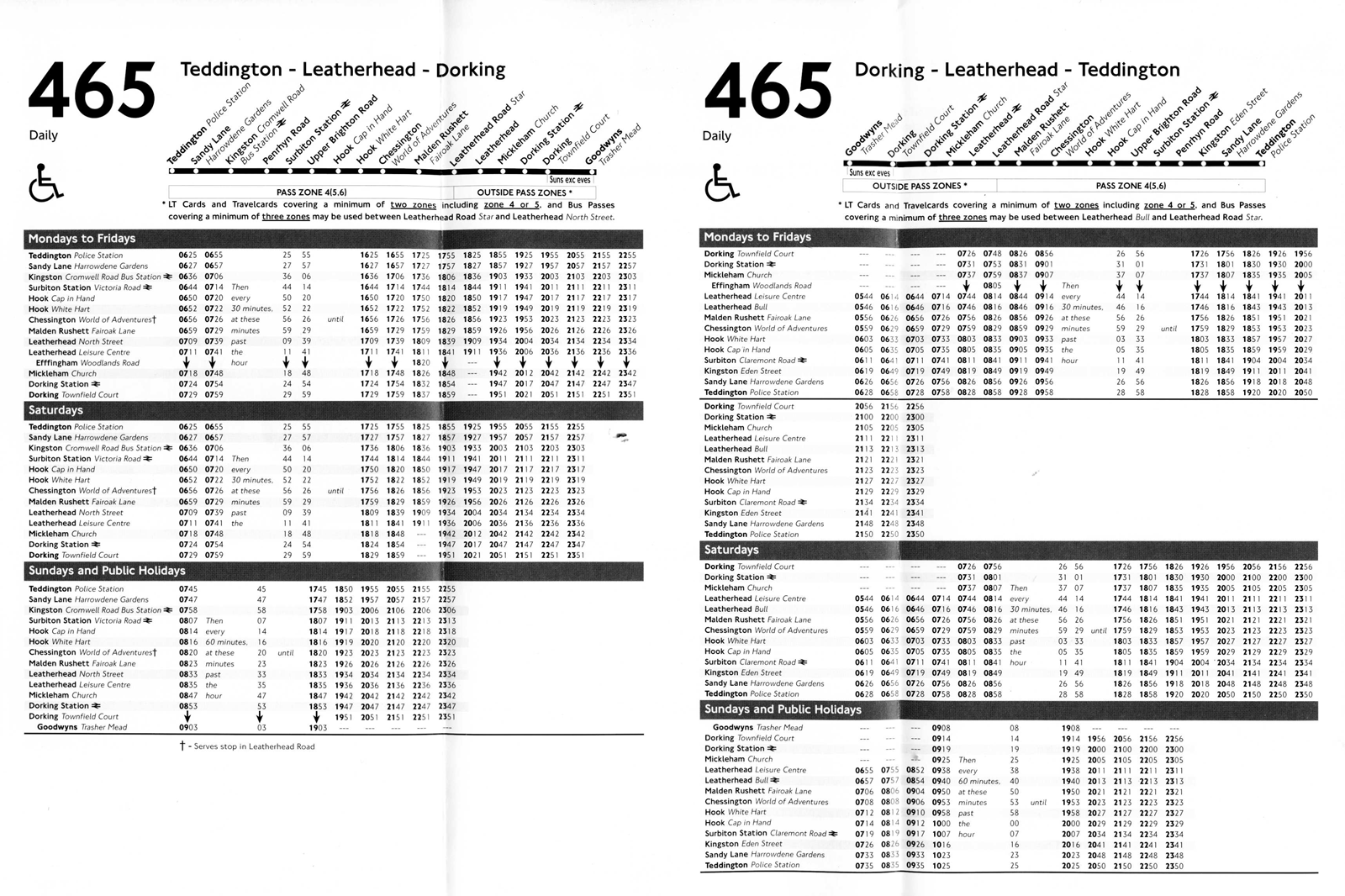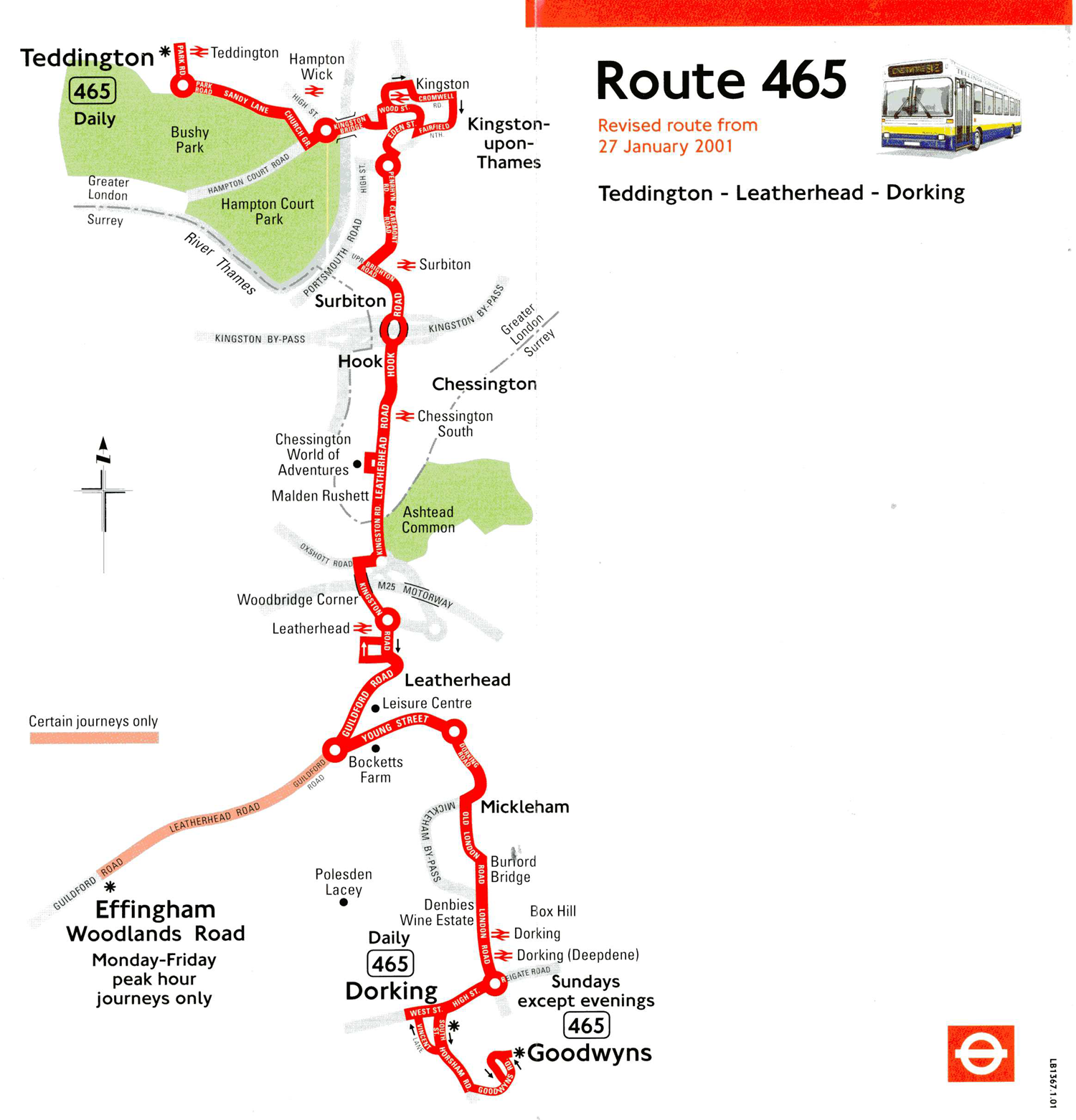 TEDDINGTON Police Station - Leatherhead - then Great Bookham - EFFINGHAM Woodlands Road (Mon-Sat) or Mickleham - DORKING Townfield Court (Mon-Sat) or DORKING Goodwyns ( Sunday daytime )