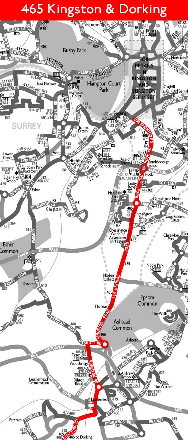 TEDDINGTON Police Station - Sandy Lane - Kingston - Surbiton - Chessington - Leatherhead - DORKING Townfield Court - DORKING Goodwyns ( Sunday daytime )