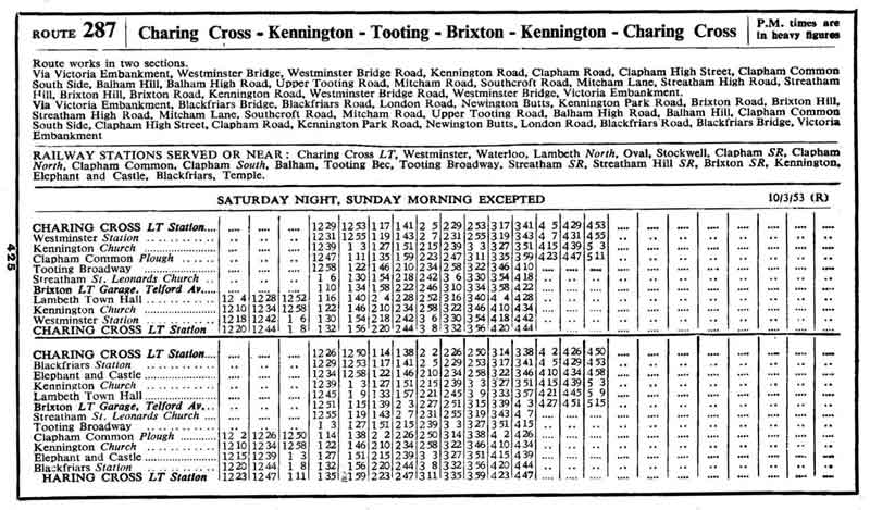 The above timetable reveals that the three journeys starting at Lambeth Town Hall were Clapham (CA) buses - hence the blind Acre Lane - Brixton etc and the three journeys starting at Clapham Common were Brixton (BN) buses - hence the Acre Lane - Clapham etc blinds. It will also be noted that all journeys in the same direction were timed to connect at Kennington Church - this was a tram tradition that carried on.