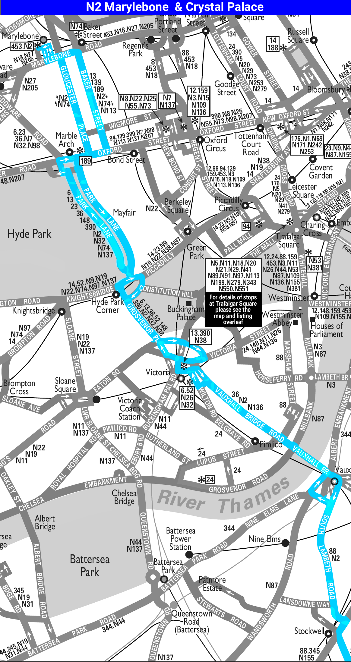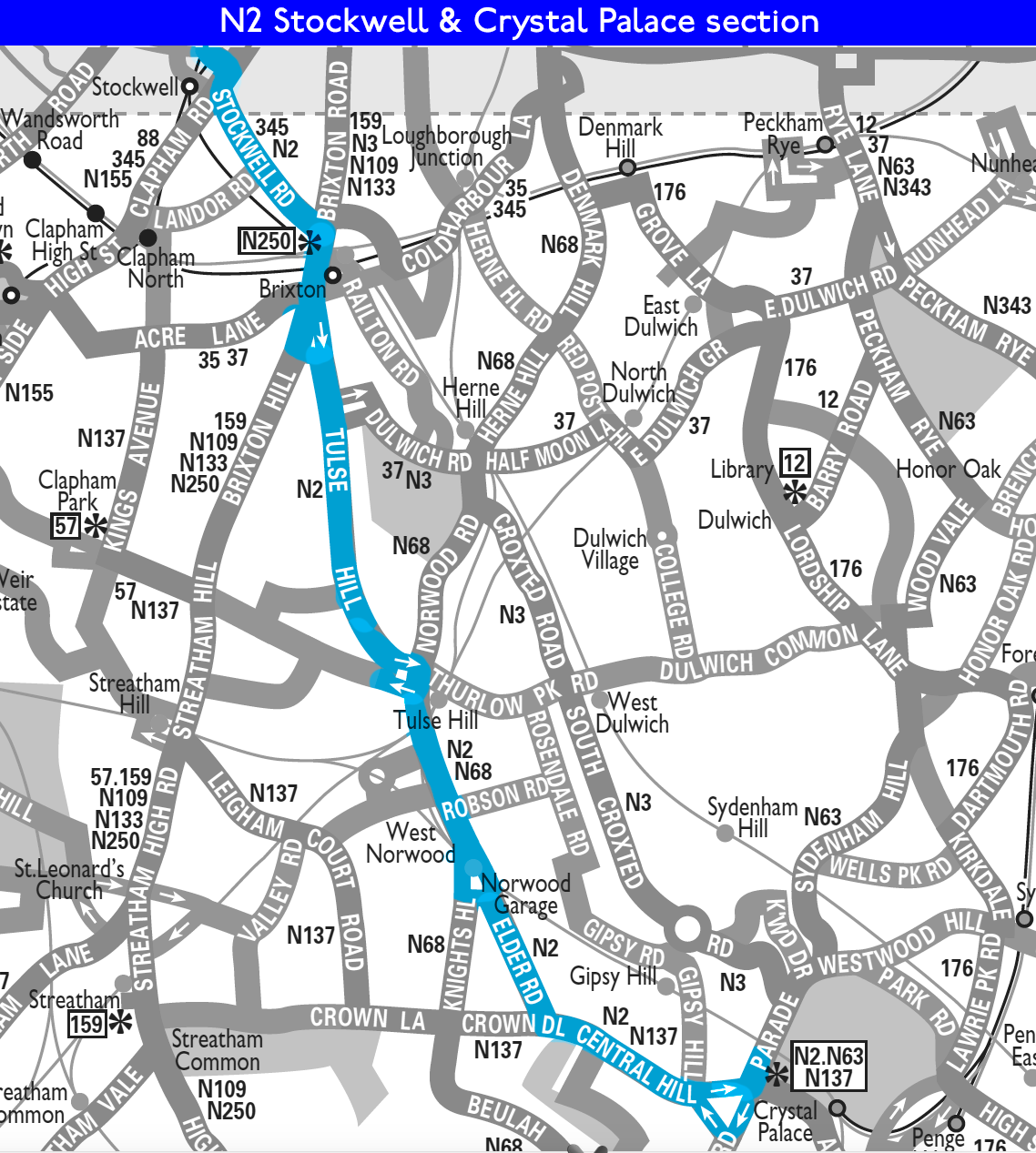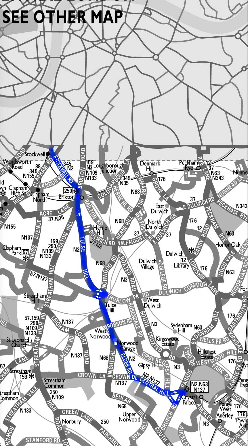HAMPSTEAD HEATH - Chalk Farm Road - Camden Town - Tottenham Court Road - Charing Cross Road - Trafalgar Square - Westminster - Victoria, Pimlico Stn - Vauxhall - Stockwell - Brixton - Tulse Hill - West Norwood - CRYSTAL PALACE