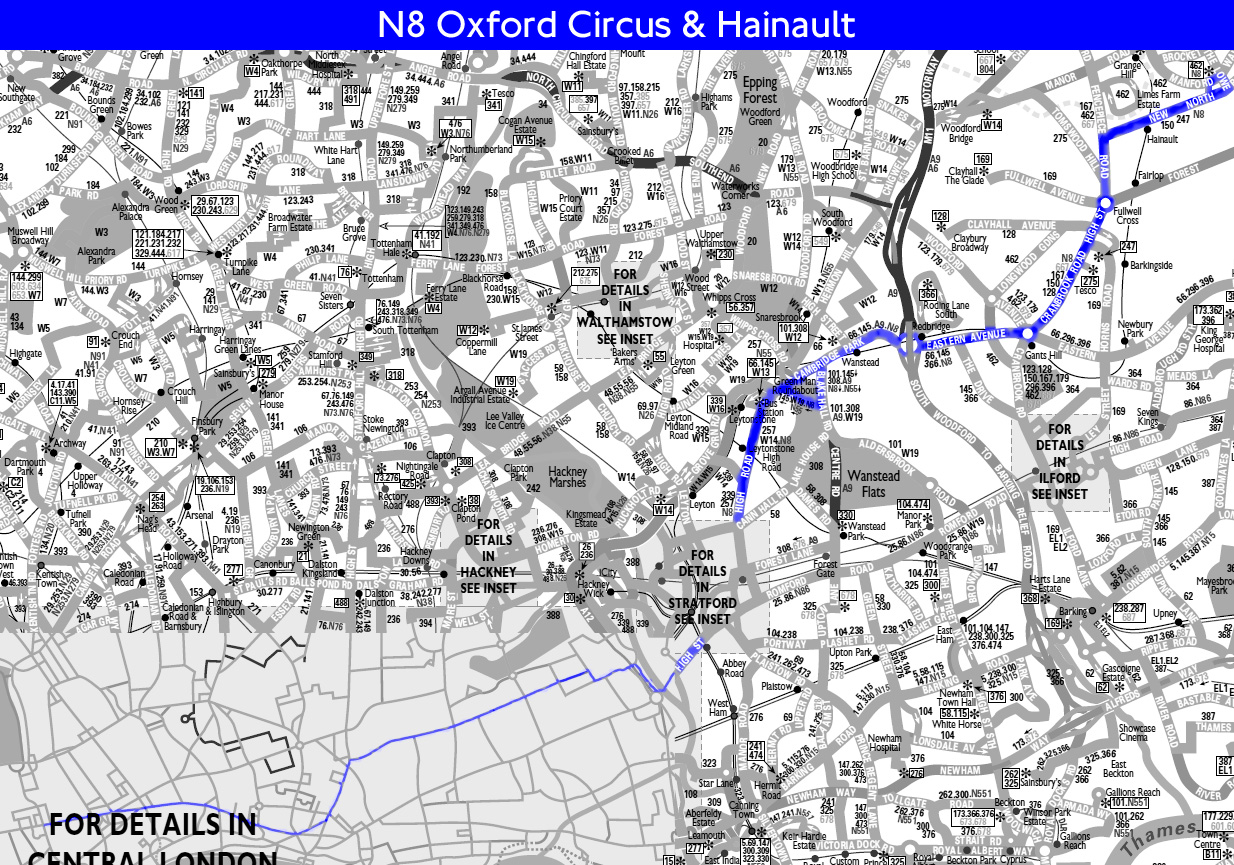 Barkingside - to Hainault replacing withdrawn section of Route N25. The Woodford