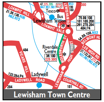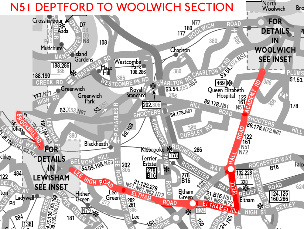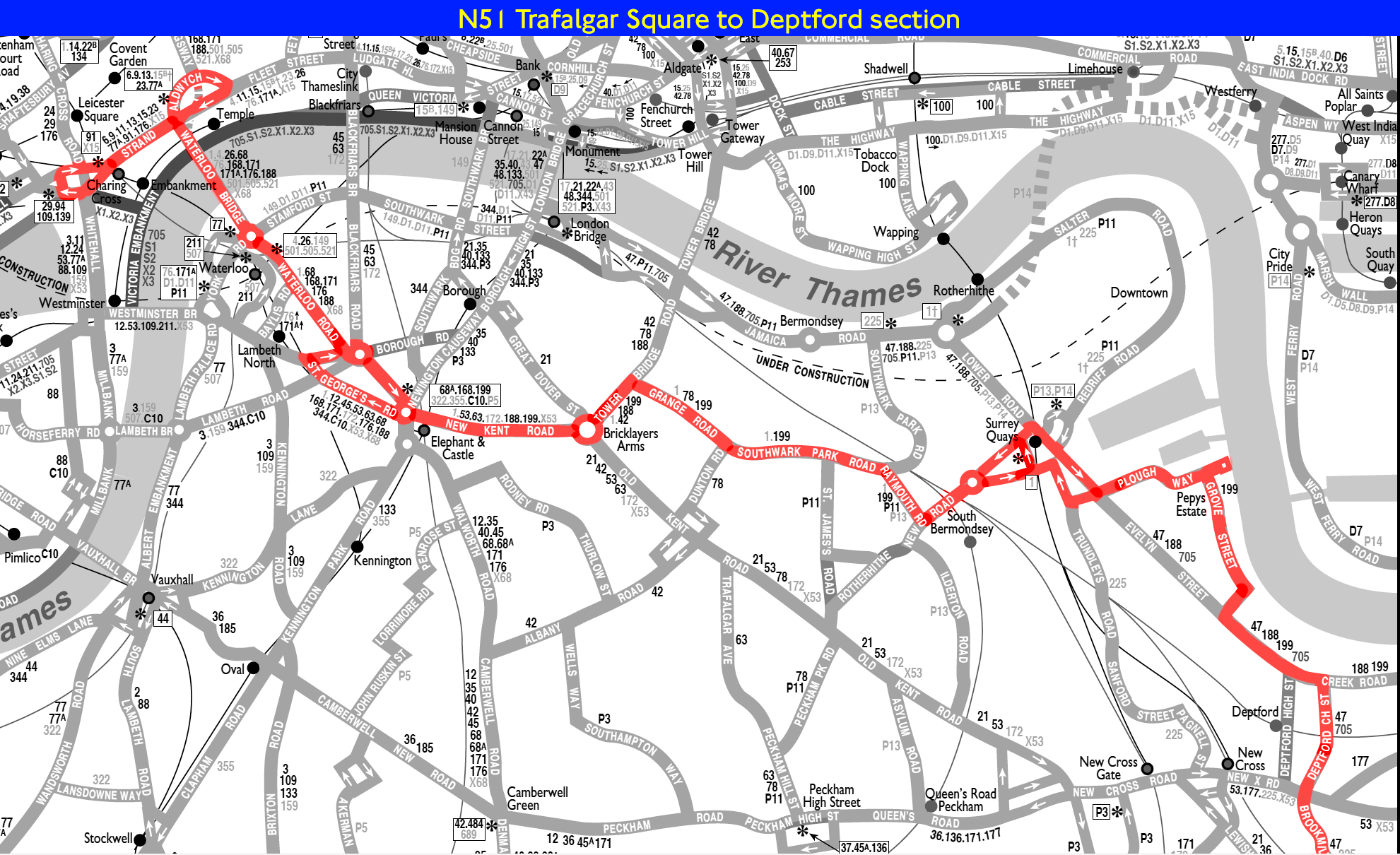 TRAFALGAR SQUARE - Aldwych - Waterloo - Elephant - Bricklayers Arms - Southwark Park Road - Surrey Quays Station - Pepys Estate - Deptford - Brookmill Road - Lewisham - Lee Green - Eltham Church - Eltham Station - Shooters Hill - WOOLWICH ARSENAL STATION