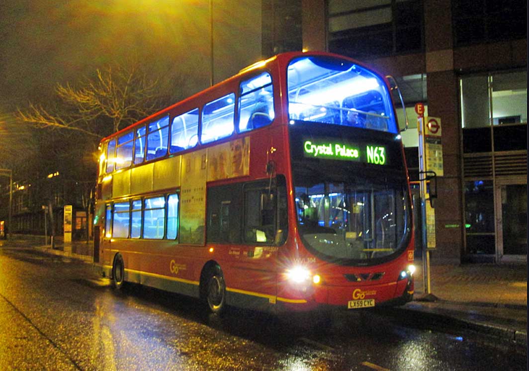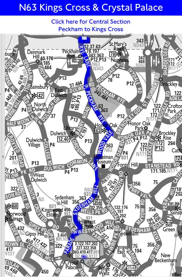 CRYSTAL PALACE - Sydenham Hill - Honor Oad - Peckham Rye - Peckham - Trafalgar Avenue - Old Kent Road - Bricklayers Arms - Elephant. Blackfriars Road - Ludgate Circus - Farringdon Road - KINGS CROSS York Way Nightly