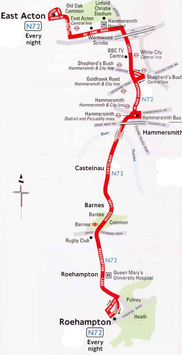 EAST ACTON Brunel Road - Ducane Road - Wood Lane - Shepherds Bush Green - Hammersmith - Barnes Station - Roehampton Lane - ROEHAMPTON Bessborough Road ( Nightly )
