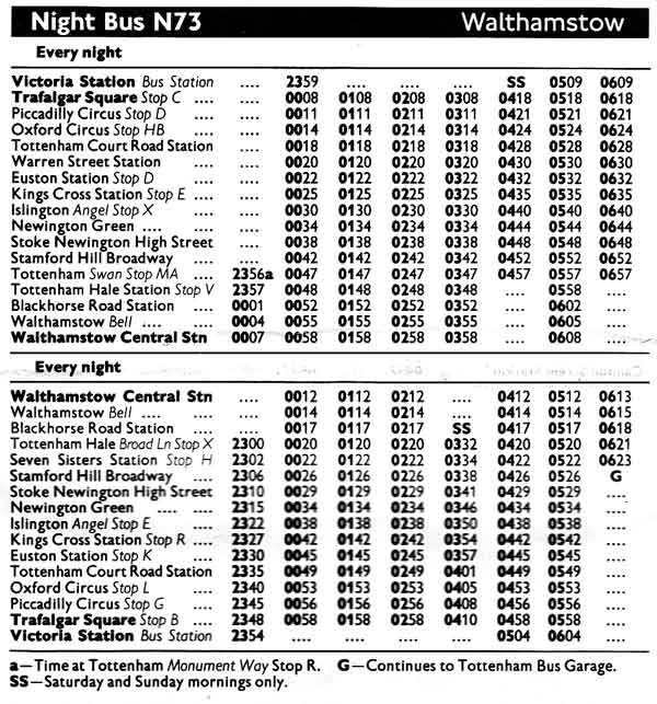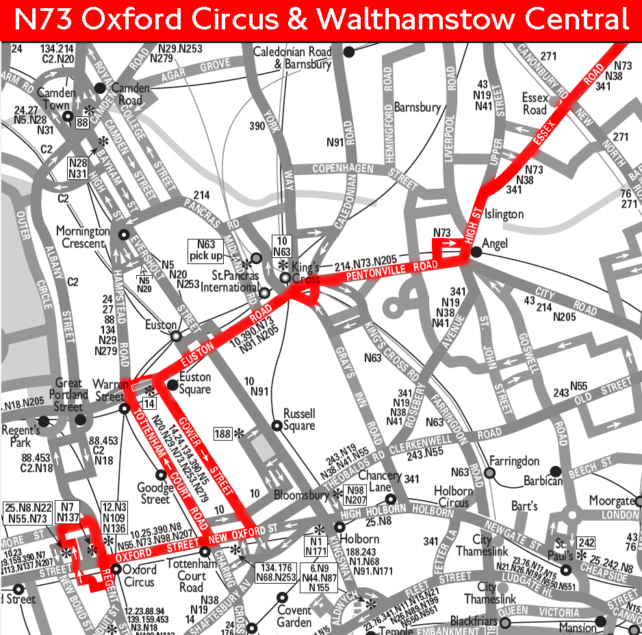 WALTHAMSTOW CENTRAL STATION - Selborne Road - Hoe Street - Forest Road - Blackhorse Road Station - Forest Road - Ferry Lane - Tottenham Hale Station - The Hale - Monument Way - Tottenham High Road - Seven Sisters Station - Stamford Hill - Stoke Newington Stoke Newington Church Street - Albion Road - Newington Green - Newington Green Road - Essex Road - Upper Street - Angel Station - Islington High Street - Pentonville Road - King's Cross Bridge - Gray's Inn Road - Kings Cross Station - Euston Road - Euston Station - Euston Road - - Gower Street - Bedford Square - Bloomsbury Street - New Oxford Street - Tottenham Court Road Station - Oxford Street - Oxford Circus - Piccadilly Circus - Trafalgar Square - Westminster - VICTORIA BUS STATION Nightly