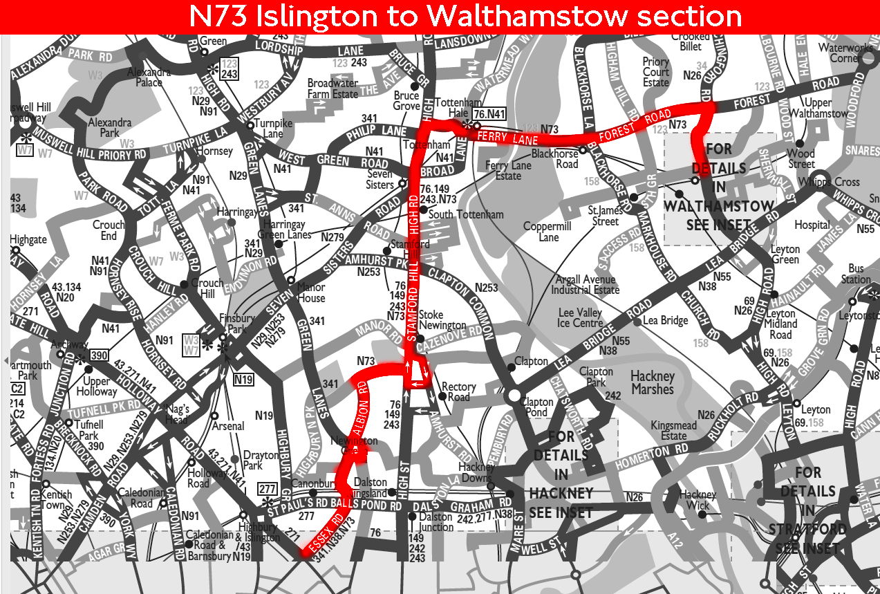 WALTHAMSTOW CENTRAL STATION - Selborne Road - Hoe Street - Forest Road - Blackhorse Road Station - Forest Road - Ferry Lane - Tottenham Hale Station - The Hale - Monument Way - Tottenham High Road - Seven Sisters Station - Stamford Hill - Stoke Newington Stoke Newington Church Street - Albion Road - Newington Green - Newington Green Road - Essex Road - Upper Street - Angel Station - Islington High Street - Pentonville Road - King's Cross Bridge - Gray's Inn Road - Kings Cross Station - Euston Road - Euston Station - Euston Road - - Gower Street - Bedford Square - Bloomsbury Street - New Oxford Street - Tottenham Court Road Station - Oxford Street - Oxford Circus - Marble Arch - Park Lane - Hyde park Corner - VICTORIA BUS STATION Nightly