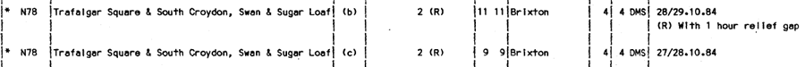 VICTORIA GARAGE ( meal relief journeys ) - Westminster - TRAFALGAR SQUARE - Strand - Aldwych - Waterloo Bridge - St Georges Circus - Elephant - Kennington - Brixton - Streatham - Norbury - Thornton Heath Pond - West Croydon - Croydon - SOUTH CROYDON Swan & Sugar Loaf ( Nightly )