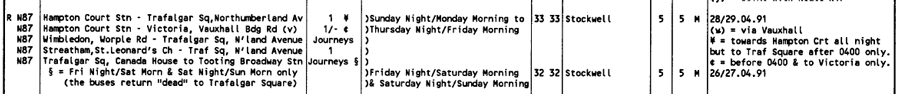 This Route was previously numbered 287 but was part of a scheme to renumber all night routes in the "N" series to make availble the numbers for the trolleybus replacent routes although in this case the number was not used until August 1962 for Barking to Brentwood service .