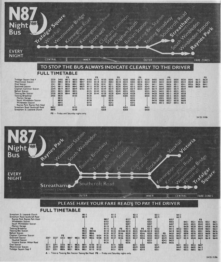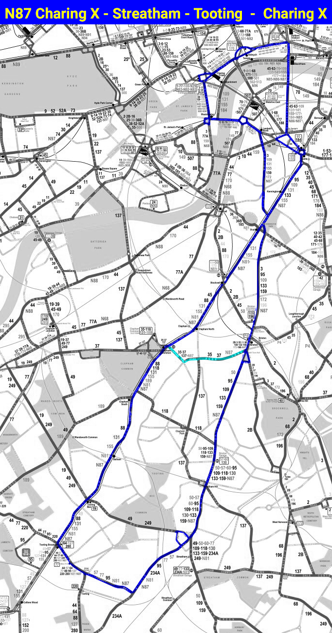TRAFALGAR SQUARE - Whitehall - Westminster Bridge - Oval -Stockwell - Clapham - Tooting - Streatham - Brixton - Oval - Westminster Bridge - Whitehall - TRAFALGAR SQUARE then as above continuing via Aldwych